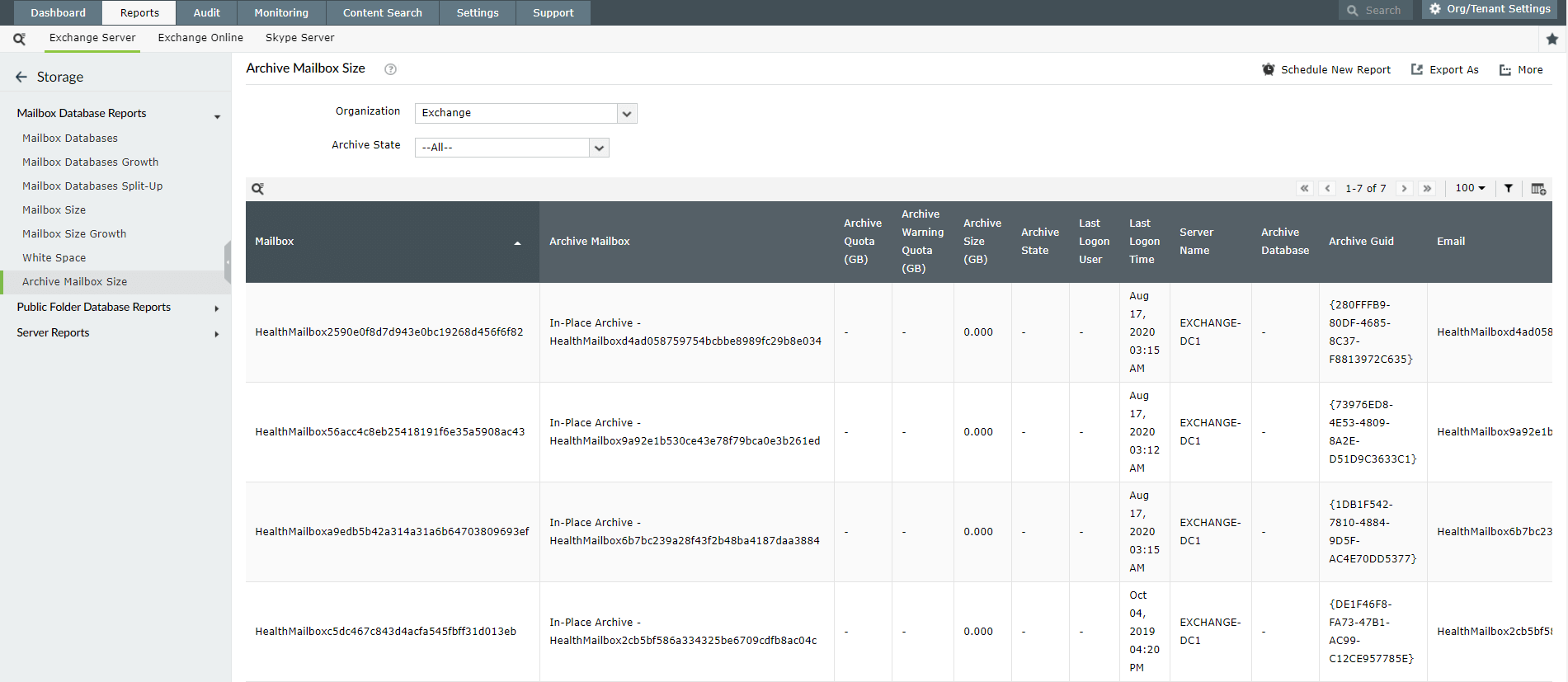 Ce rapport affiche les noms de toutes les boîtes aux lettres Microsoft 365 archivées localement. Il affiche également des indicateurs comme la taille de l'archive, son quota affecté et l'avertissement basé sur la consommation de quota.