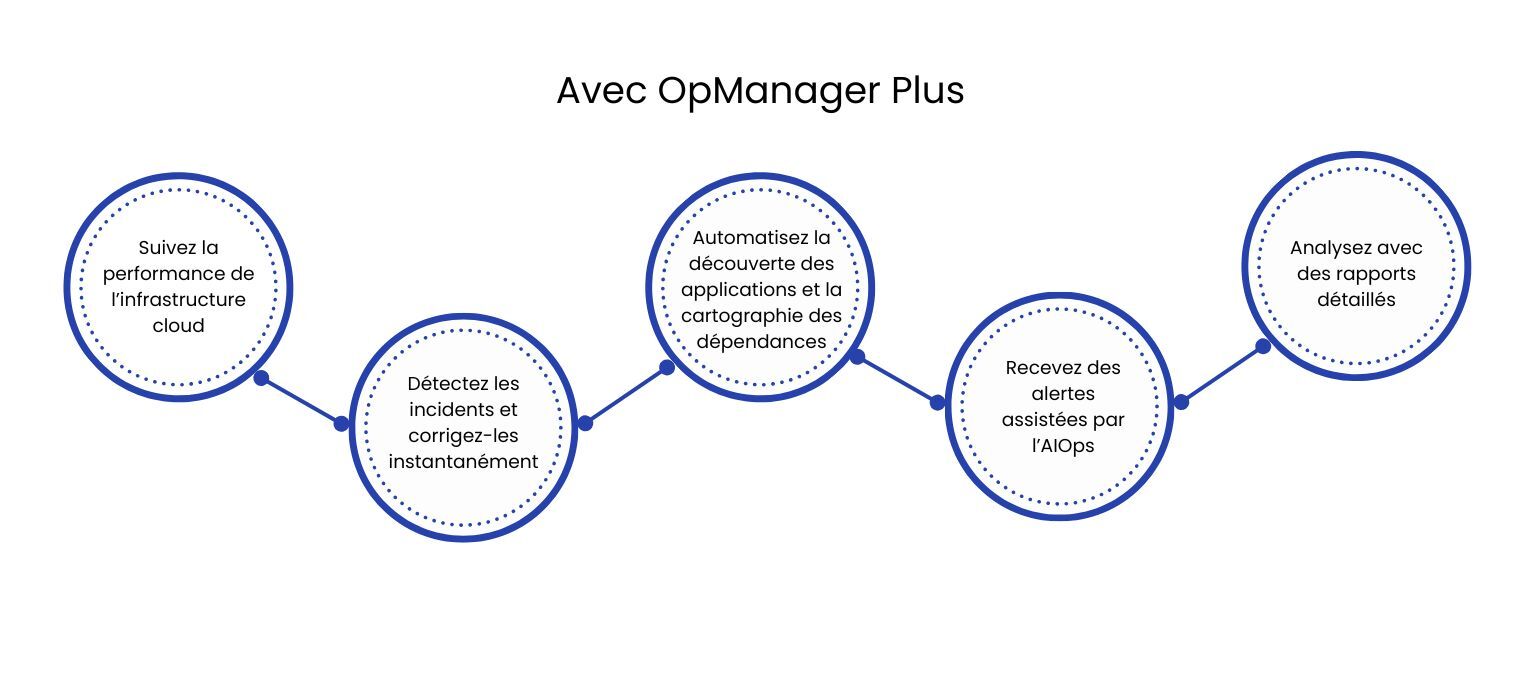 OpManager Plus permet d’examiner précisément les KPI stratégiques de l’environnement cloud, qu’il soit privé, public ou hybride, sans exiger d’y consacrer trop de temps et de ressources. Cet outil d’observabilité cloud complet gère les services offerts par AWS, Azure, Google Cloud, Oracle Cloud, Kubernetes, Docker, Red Hat OpenShift et OpenStack. Obtenez des métriques d’état, de disponibilité et autres cruciaux et comprenez la raison à l’origine d’une baisse de performance. Sa résolution dope le taux de performance du réseau.
