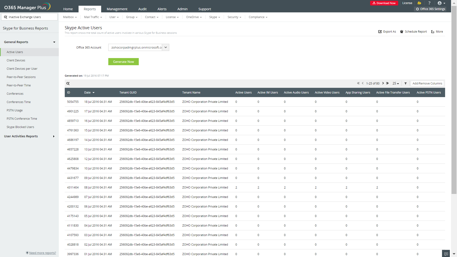 Le rapport sur les utilisateurs actifs d'M365 Manager Plus présente l'utilisation de Skype Entreprise dans votre organisation. Il indique le nombre d'utilisateurs actifs chaque jour. De plus, il donne une répartition des utilisateurs actifs selon les fonctionnalités deSkype Entreprise qu'ils ont utilisées.