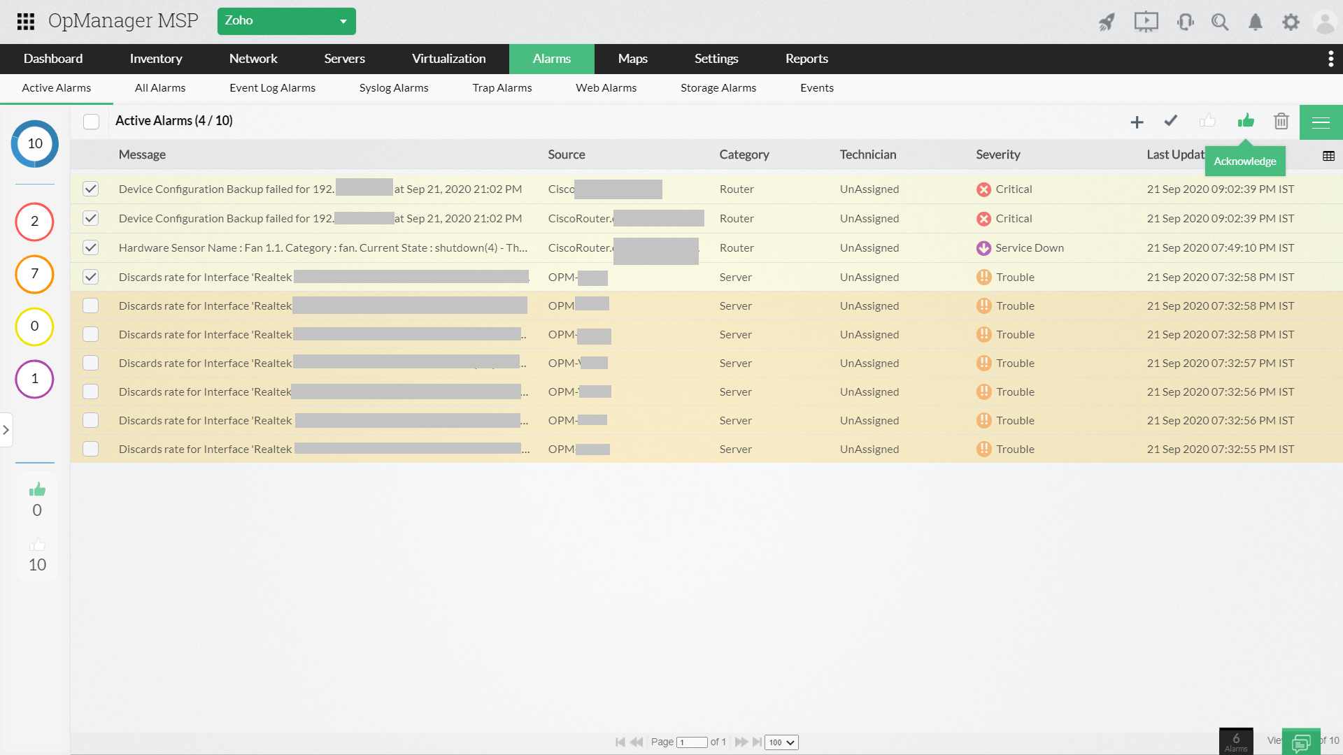 OpManager MSP cerne les événements/incidents critiques dans tous ceux identifiés, facilitant la tâche des techniciens. L’outil utilise des techniques comme la déduplication et la corrélation pour y parvenir.