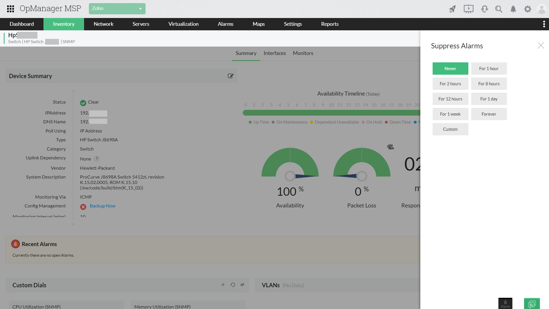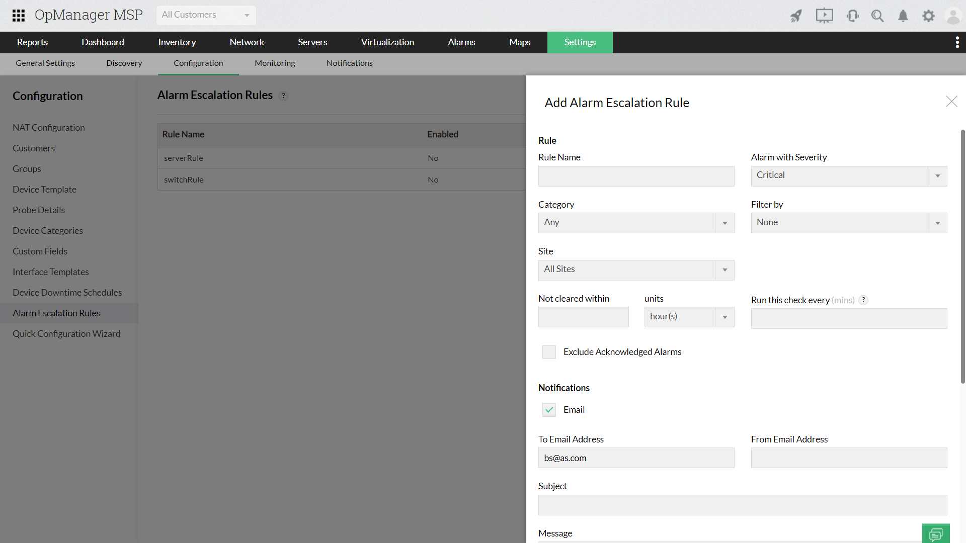OpManager MSP permet d’accuser réception d’alarmes pour éviter d’avoir à vérifier une alarme déjà transmise. On peut aussi supprimer des alarmes pour des intervalles indiqués. Cela s’avère pratique pendant la maintenance planifiée, pour désactiver l’analyse d’appareils en cours de maintenance. De plus, OpManager MSP permet de remonter (ou réaffecter) des alarmes à des adresses électroniques ou des ID donnés si elles n’ont pas été transmises après un laps de temps précis, sortent du champ d’expertise d’un technicien ou exigent un service plus pointu.