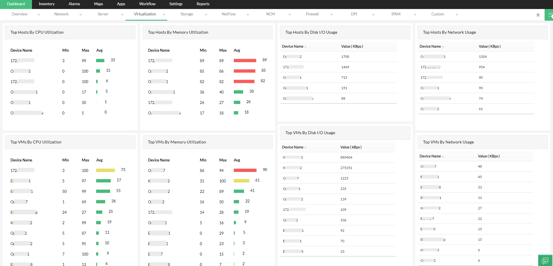 Il est quasiment impossible pour un administrateur réseau de prendre des décisions stratégiques sans une vision globale, en l'occurrence la disponibilité et l'intégrité de l'environnement Hyper-V.Grâce aux tableaux de bord spécifiques à Hyper-V d'OpManager, vous pouvez surveiller l'état de votre environnement virtuel Windows depuis un emplacement unique.Le tableau de bord Hyper-V liste les appareils par consommation maximale de ressources, vous aidant ainsi à suivre les machines virtuelles et hôtes sollicitant le plus de ressources, et à prévenir les goulots d'étranglement de performances.