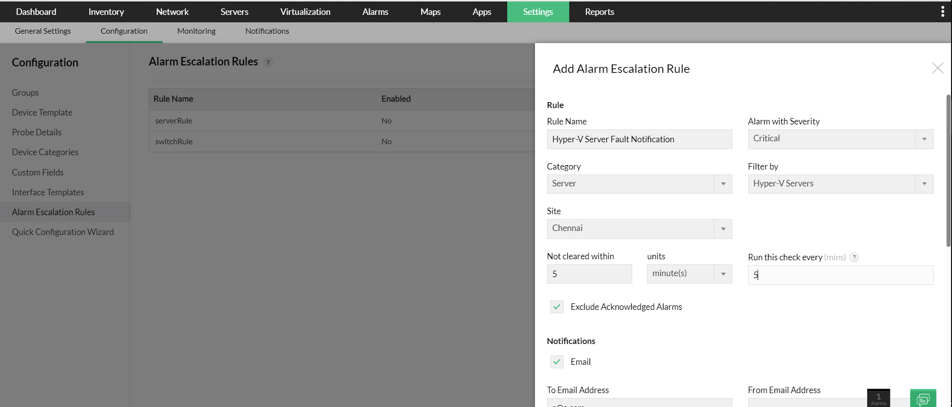 Si les défaillances Hyper-V ne sont pas traitées à temps, l’environnement Hyper-V peut subir des problèmes de performance pouvant aller jusqu’au plantage complet. Pour éviter cela, vous pouvez utiliser la fonctionnalité d’escalade des alarmes d’OpManager. L’escalade des alarmes vous permet de transmettre automatiquement les alertes Hyper-V à un niveau supérieur si l’alarme n’est pas acquittée. Grâce aux options de personnalisation, vous pouvez sélectionner le(s) serveur(s) Hyper-V concerné(s), définir des conditions spécifiques et acheminer les alarmes vers les destinataires de votre choix. De plus, OpManager vous permet de notifier les défaillances Hyper-V via SMS, e-mails, canaux Slack, etc., ou directement dans OpManager.