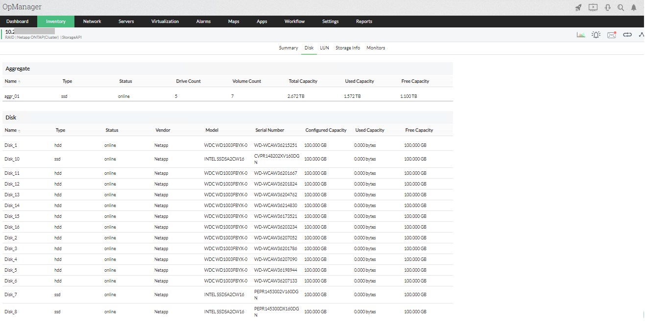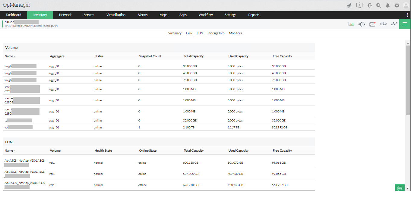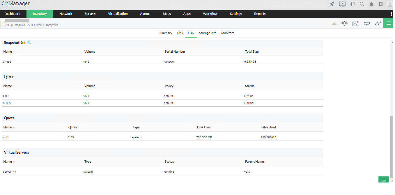 Avec l’analyse NetApp d'OpManager, explorez même les plus petites entités de données de vos appliances NetApp. OpManager a des modèles de périphériques intégrés qui vous permettent de tout surveiller, des clusters, agrégats et volumes aux numéros d'unité logique (LUN) et qtrees, ce qui le rend en fait un outil d’analyse du stockage NetApp efficace pour votre réseau. OpManager vous permet d’analyser l'utilisation et la capacité de tous les segments de votre stockage NetApp pour obtenir des prévisions de capacité de stockage optimales.