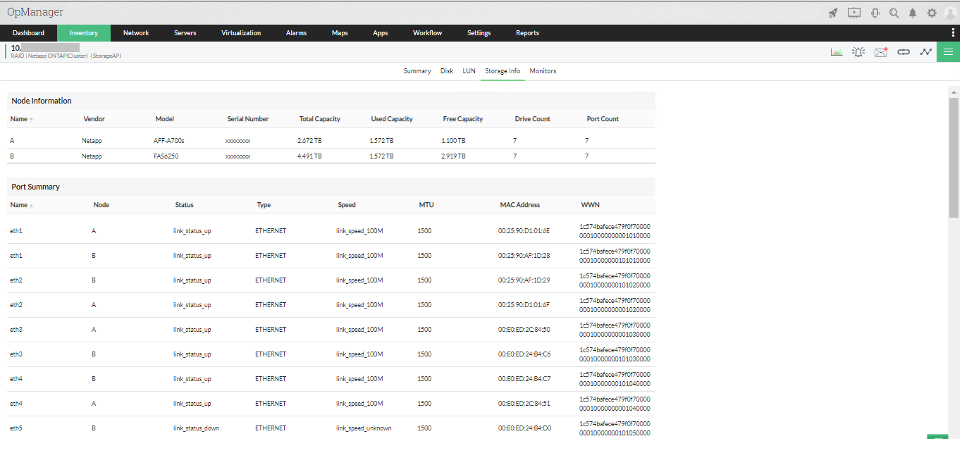 L'outil d’analyse NetApp d'OpManager vous permet également de contrôler les nœuds et chaque port individuel connecté à vos appliances NetApp avec la plus grande précision. De plus, vous pouvez facilement mapper chaque serveur virtuel avec son volume correspondant consommé depuis votre stockage NetApp.