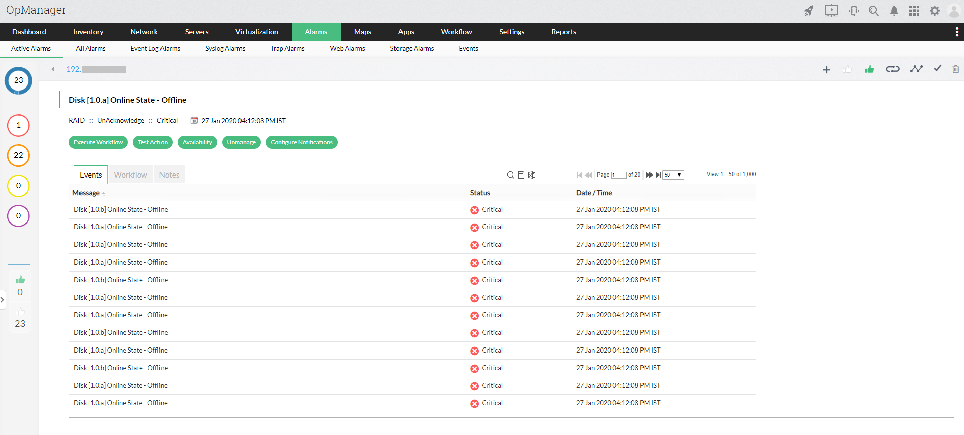 Avec OpManager, allez plus loin et analysez les attributs supplémentaires de vos appliances de stockage NetApp. Vérifier l'état et le fonctionnement des alimentations et des batteries associées qui aident à alimenter ces appareils, et suivez l'état du matériel et des capteurs matériels pour assurer un fonctionnement robuste à un niveau holistique.