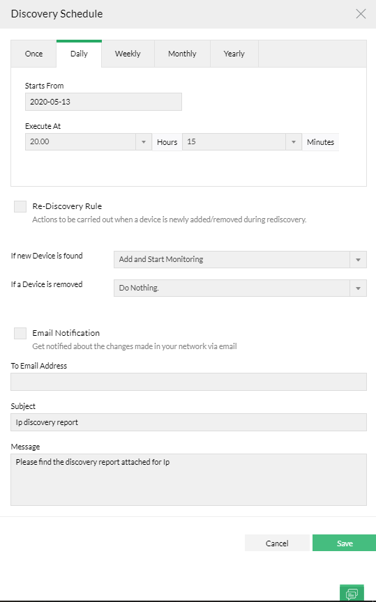 Vous pouvez spécifier par e-mail une adresse e-mail à laquelle un rapport détaillé du processus de découverte sera envoyé et OpManager enverra un e-mail avec une copie du rapport de découverte attaché à l'adresse e-mail spécifiée après chaque processus de découverte.