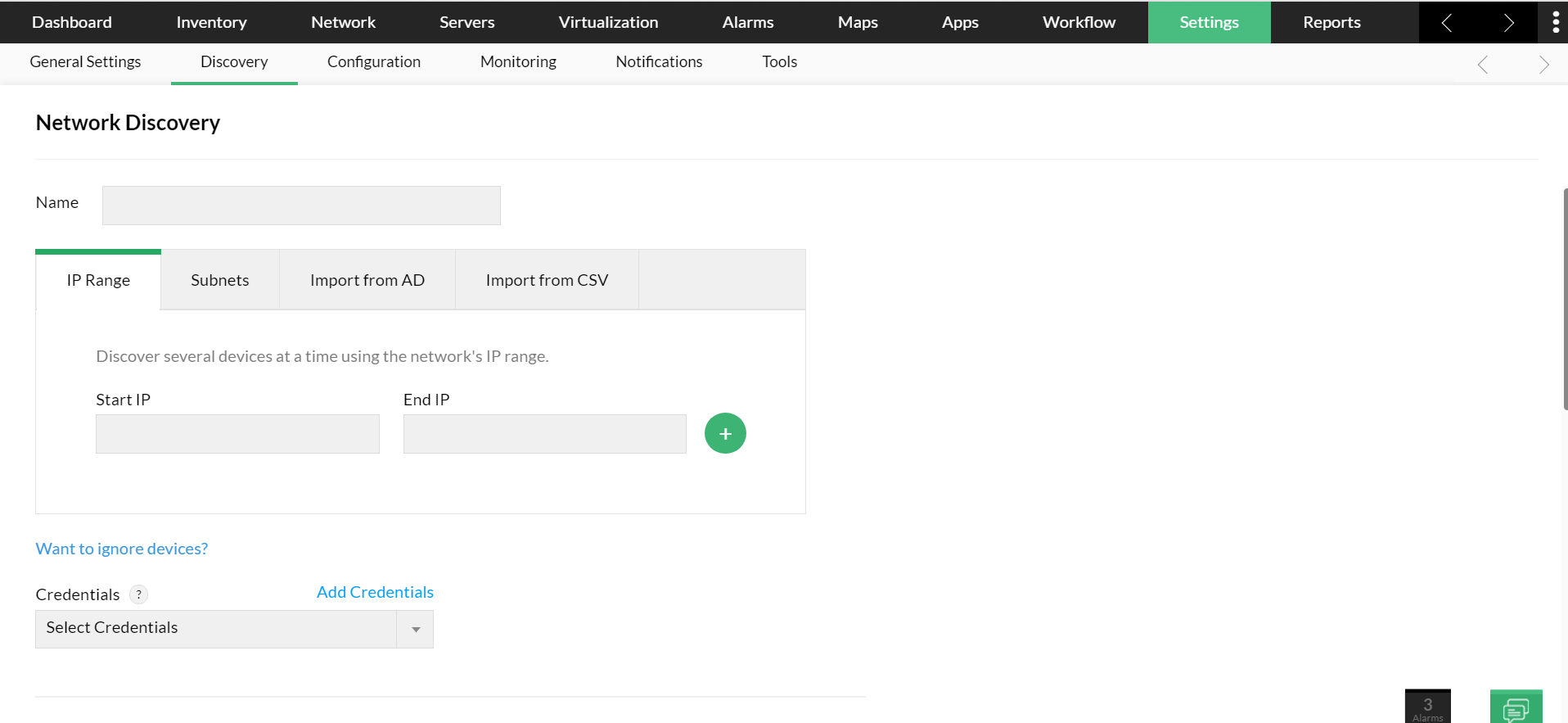 Découverte en masse : Vous avez besoin de découvrir plusieurs appareils mais vous détestez les taper un par un ? Pas de soucis ! Entrez simplement l'IP de début et de fin dans la plage d'adresses IP et OpManager découvrira les périphériques dans la plage IP particulière. Vous pouvez également choisir d'ignorer certains appareils dans la plage IP spécifiée.