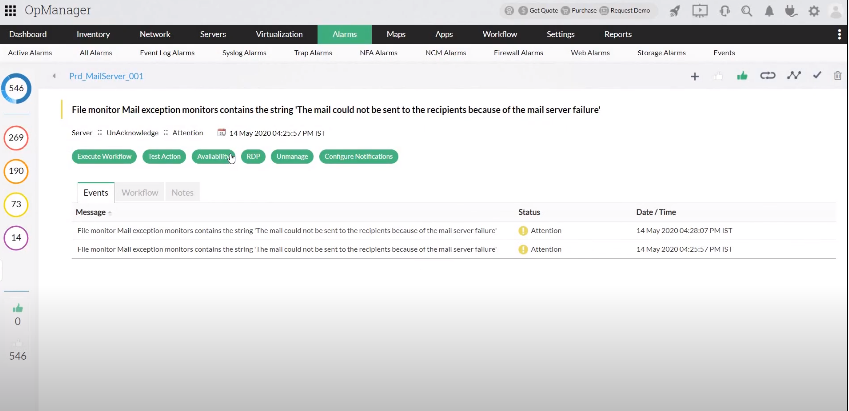 Lorsque l'agent installé sur un appareil tombe en panne, OpManager vous alerte par e-mail et alarmes dans son interface Web. Lorsqu'il trouve la chaîne spécifiée dans les journaux du serveur associé, l'agent informe immédiatement le serveur OpManager en temps réel, qui à son tour déclenche une alarme en fonction de l'intervalle d'interrogation que vous avez défini.