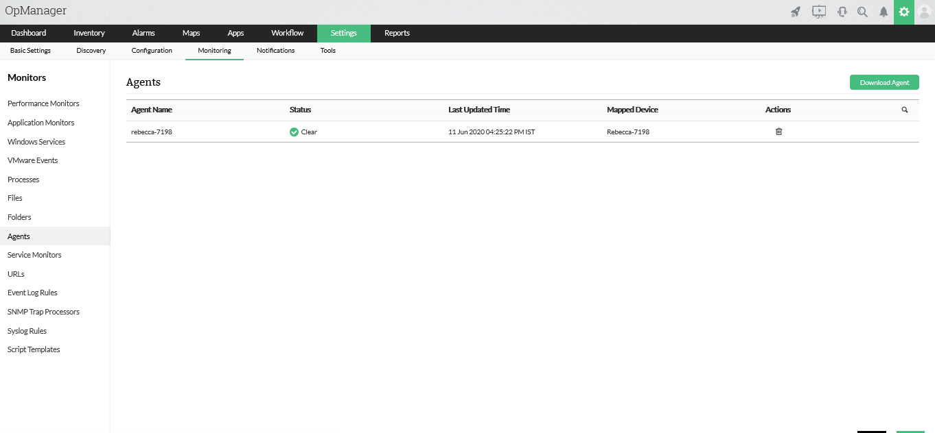 À l'aide d'un logiciel d’analyse des journaux de serveur basé sur un agent, le contenu du fichier journal peut être surveillé pour les erreurs et les exceptions; cela vous donne une idée claire de l'état de l'application en cours d'exécution sur le serveur. Dans OpManager, le téléchargement et l'activation de l'agent ne prennent qu'une étape: installez l'agent sur le serveur qui exécute l'application stratégique dont vous souhaitez analyser les journaux. Une fois l'agent téléchargé dans OpManager, vous pouvez afficher l'état et l'heure de la dernière mise à jour de l'agent. Une fois l'agent mappé à un serveur particulier et que vous avez ajouté un terme de recherche dans le fichier journal, l'agent recherche toute occurrence du terme et déclenche une alarme qui mentionne la gravité du problème.