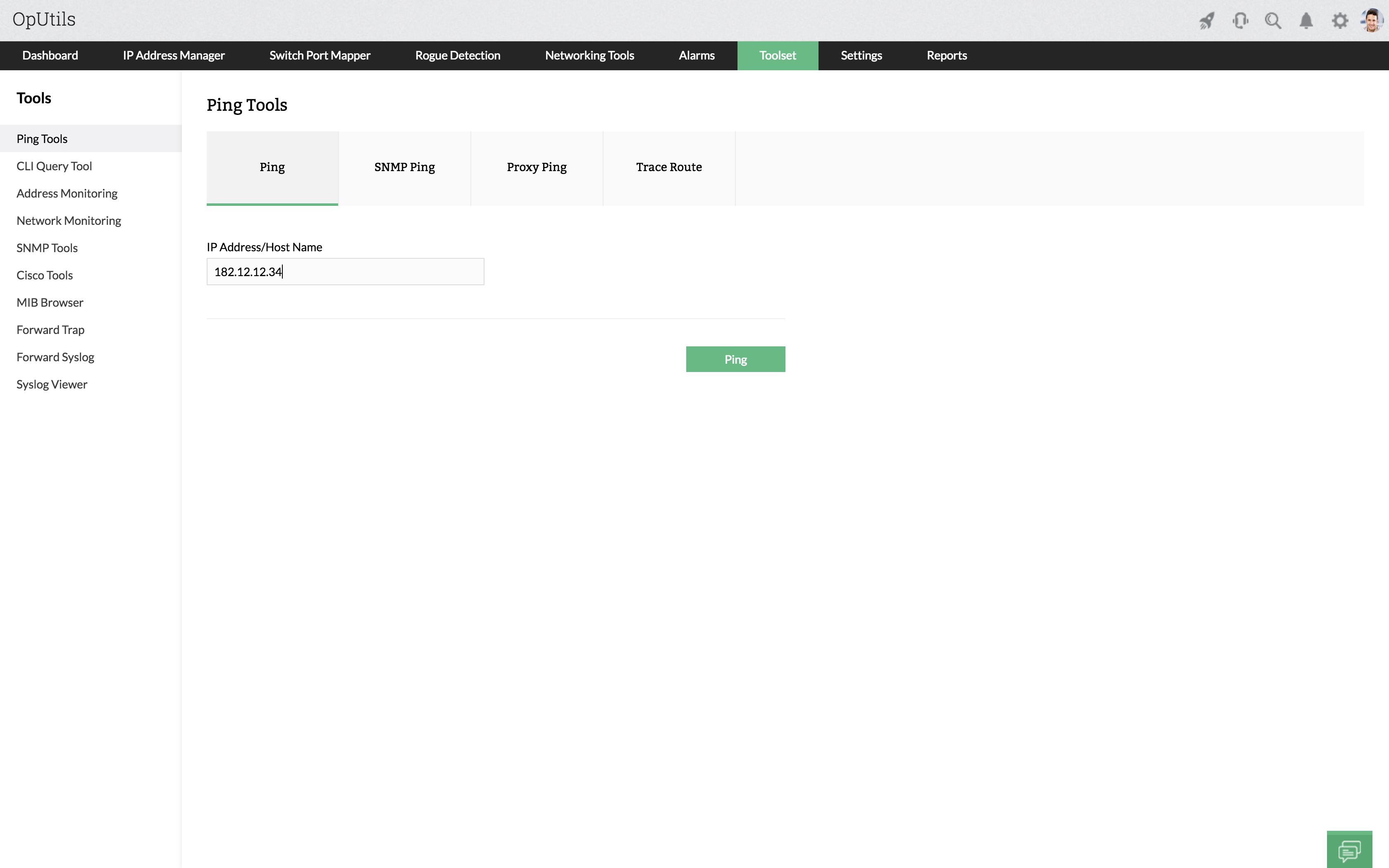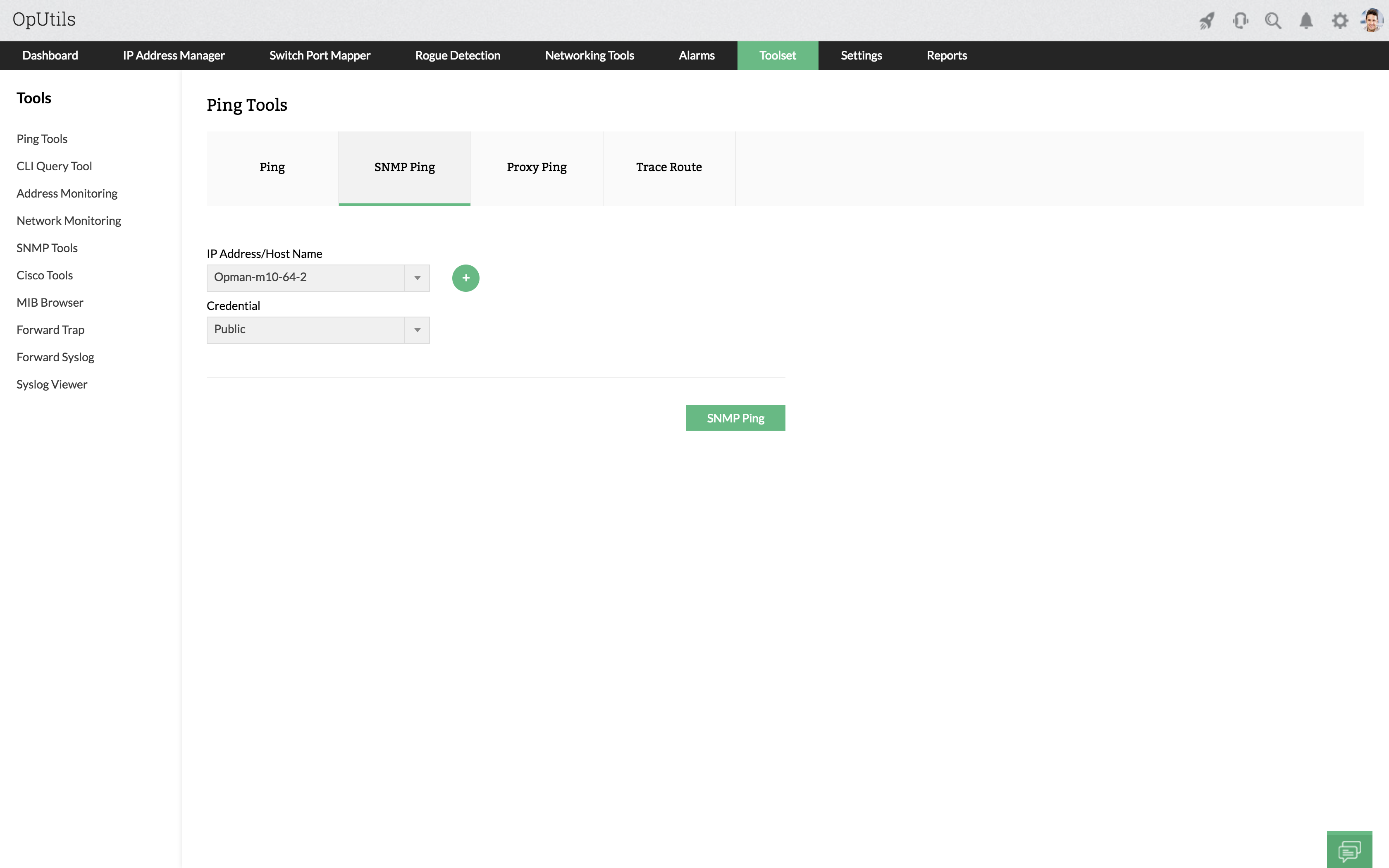 L'outil SNMP Ping d'OpUtils vérifie si un nœud est compatible SNMP ou non. SNMP Ping aide les ingénieurs réseau en tant qu'outil de diagnostic SNMP à connaître la disponibilité d'un périphérique et fournit des informations de base telles que le nom DNS, le nom du système, l'emplacement, le type de système et la description du système. Après la détection SNMP, si nécessaire, plus de détails sur le nœud peuvent être récupérés à l'aide d'outils de ping SNMP tels que SNMP walker, MIB Browser et SNMP Graph.