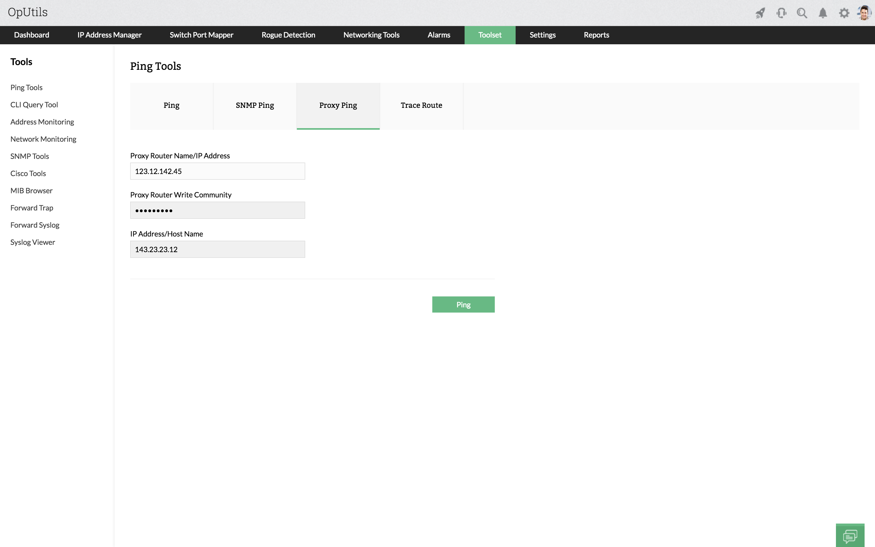 L'outil de ping proxy est tout comme l'outil ping SNMP. Il vous permet d'envoyer une requête ping à un périphérique cible mais à l'aide d'un routeur Cisco. Le routeur agit en tant que proxy pour le périphérique cible et répond à la requête ping SNMP.