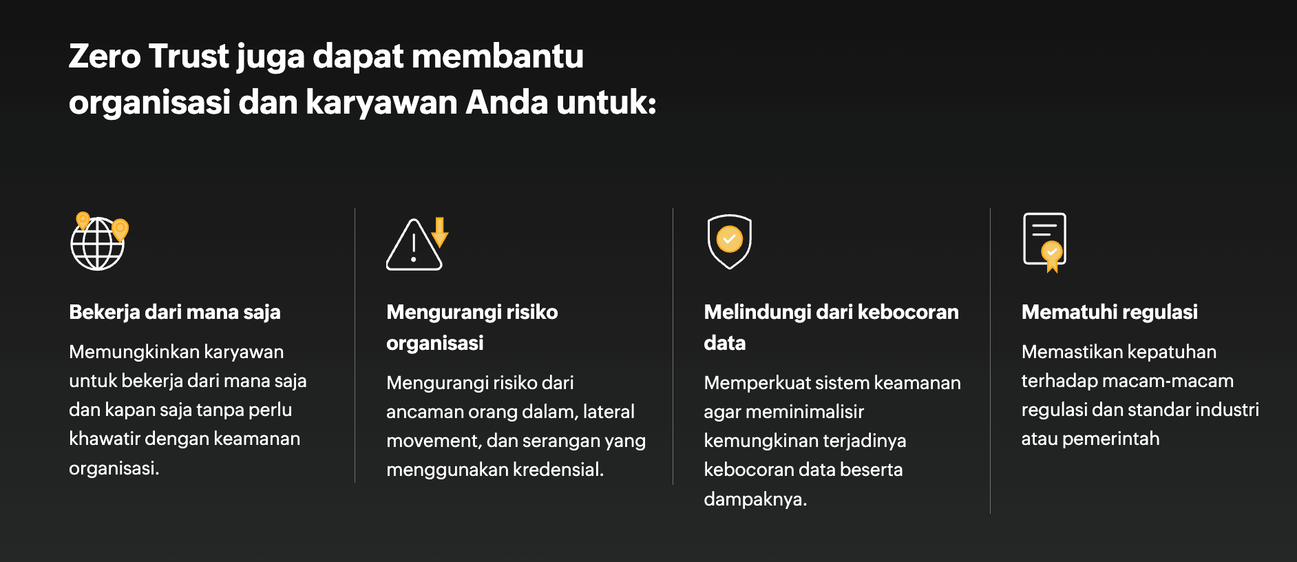 AI mempercepat dan mempermudah eksploitasi kredensial, sehingga identitas menjadi garis pertahanan yang paling kritikal. Solusi Zero Trust memastikan bahwa setiap permintaan akses bahkan dari perangkat atau jaringan internal dianggap berpotensi berbahaya sampai diverifikasi. Melalui pendekatan ini, pelaku yang berhasil mencuri satu akun tidak dapat bergerak bebas di dalam sistem.