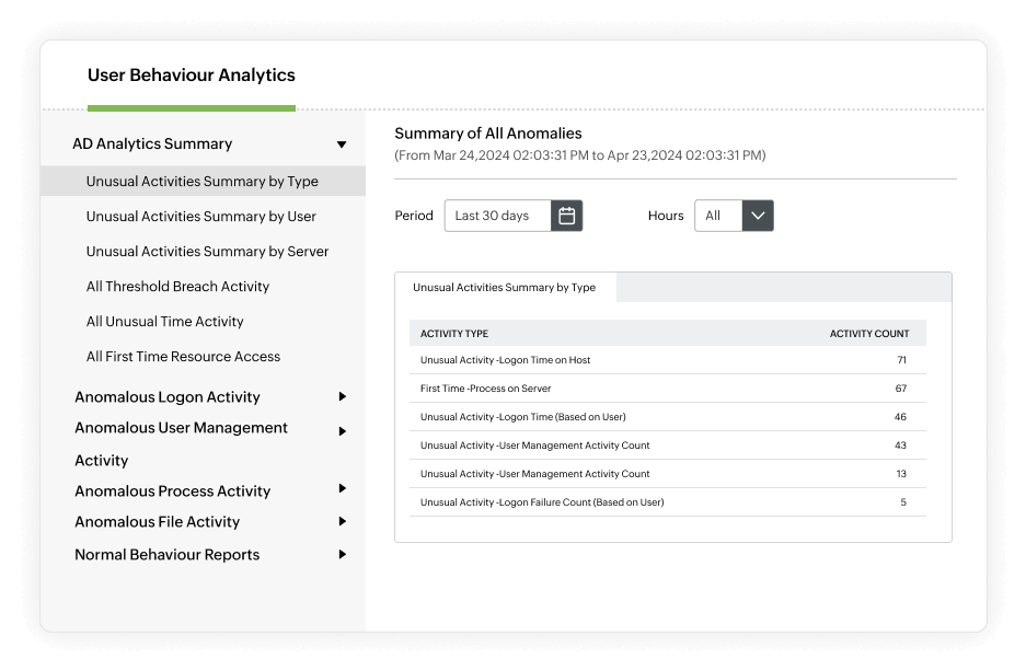 AD360 memanfaatkan machine learning (ML) untuk menghadirkan analisis prediktif dalam identity security. Melalui user behavior analytics, AD360 mempelajari baseline normal dari akun dan aplikasi. Jika terjadi penyimpangan seperti login dari lokasi yang tidak biasa, peningkatan hak akses secara tiba-tiba, atau permintaan akses yang tidak wajar maka sistem akan menandainya sebagai potensi risiko. Dengan menghubungkan berbagai anomali ini secara hampir real-time, tim keamanan dapat merespons anomali lebih cepat sebelum berkembang menjadi insiden, terutama yang berkaitan dengan insider threat atau penyalahgunaan kredensial.