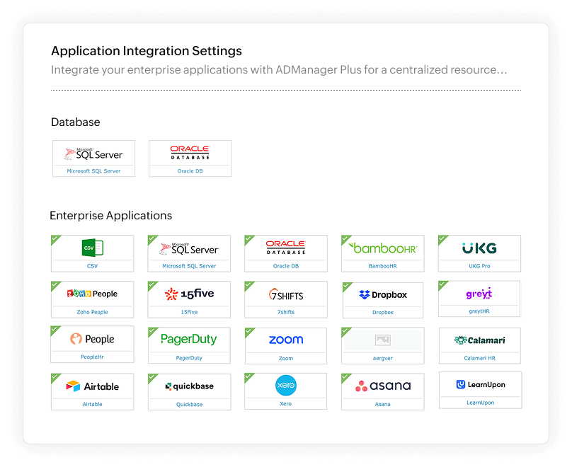 Dengan API REST dan SOAP, AD360 dapat terintegrasi dengan berbagai database seperti MS SQL dan Oracle DB, serta aplikasi HR custom. Integrasi ini memastikan pertukaran data identitas pengguna berjalan dengan lancar dan konsisten.