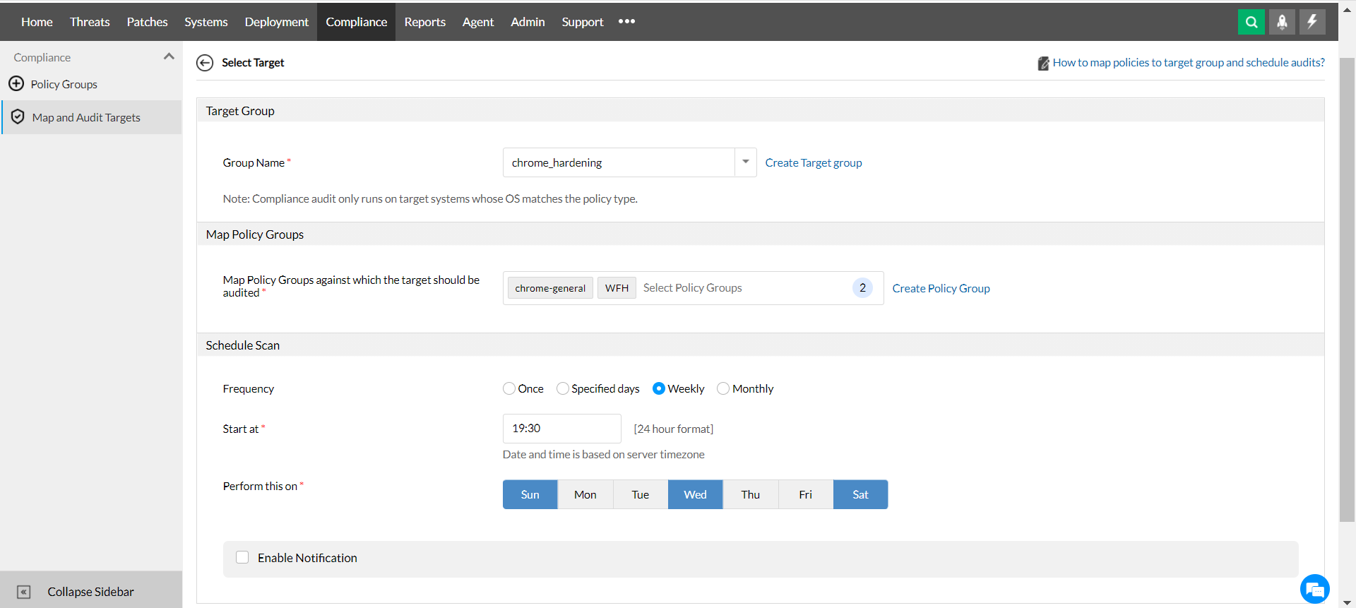 Setelah kebijakan compliance ditentukan, langkah berikutnya adalah menerapkannya pada sistem atau perangkat yang ingin diaudit, seperti server, endpoint, atau grup tertentu dalam jaringan. Proses ini biasanya dilengkapi dengan kemampuan untuk menjadwalkan audit secara berkala, sehingga penilaian konfigurasi tidak hanya dilakukan sekali, tetapi berlangsung secara berkelanjutan. Menggunakan penjadwalan, tim IT dapat memastikan bahwa setiap perubahan konfigurasi sistem tetap terpantau dan tidak menyimpang dari standar keamanan yang telah ditetapkan.