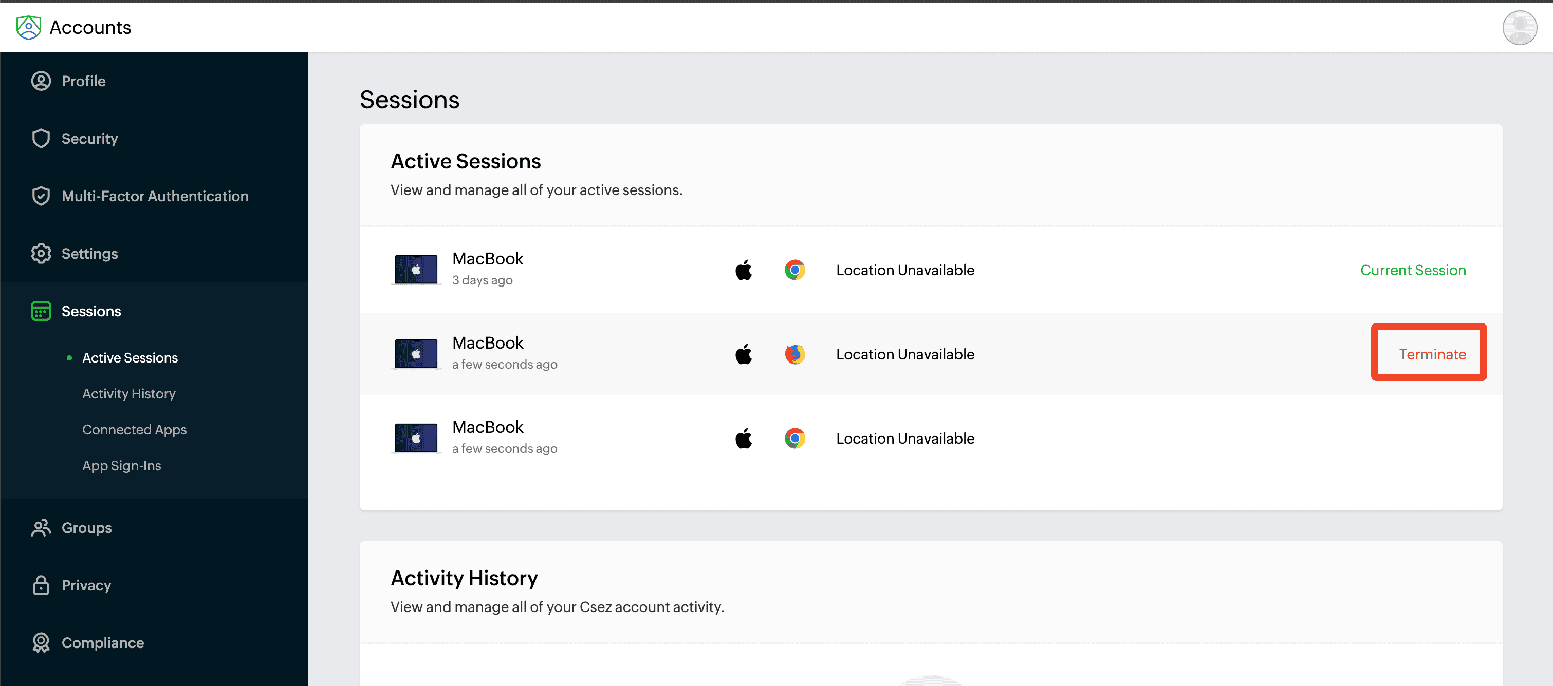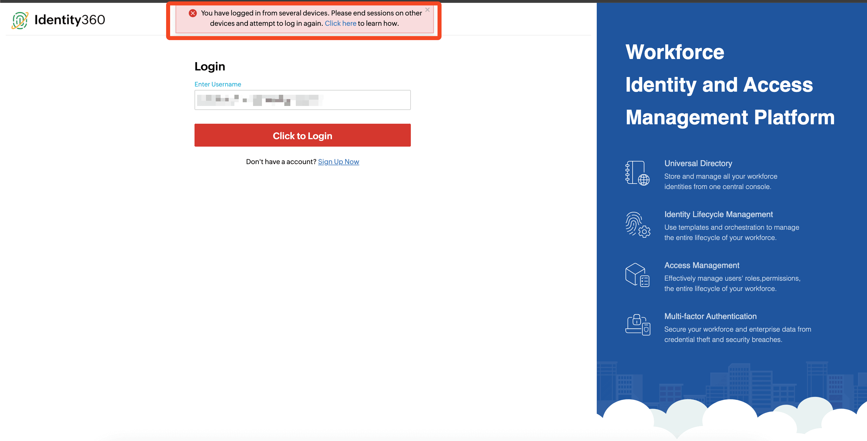 Cause: The maximum concurrent sessions limit has been reached for a user, and they are prompted to terminate active sessions. If the user has logged in directly via the Identity360 portal, the following error message appears:
