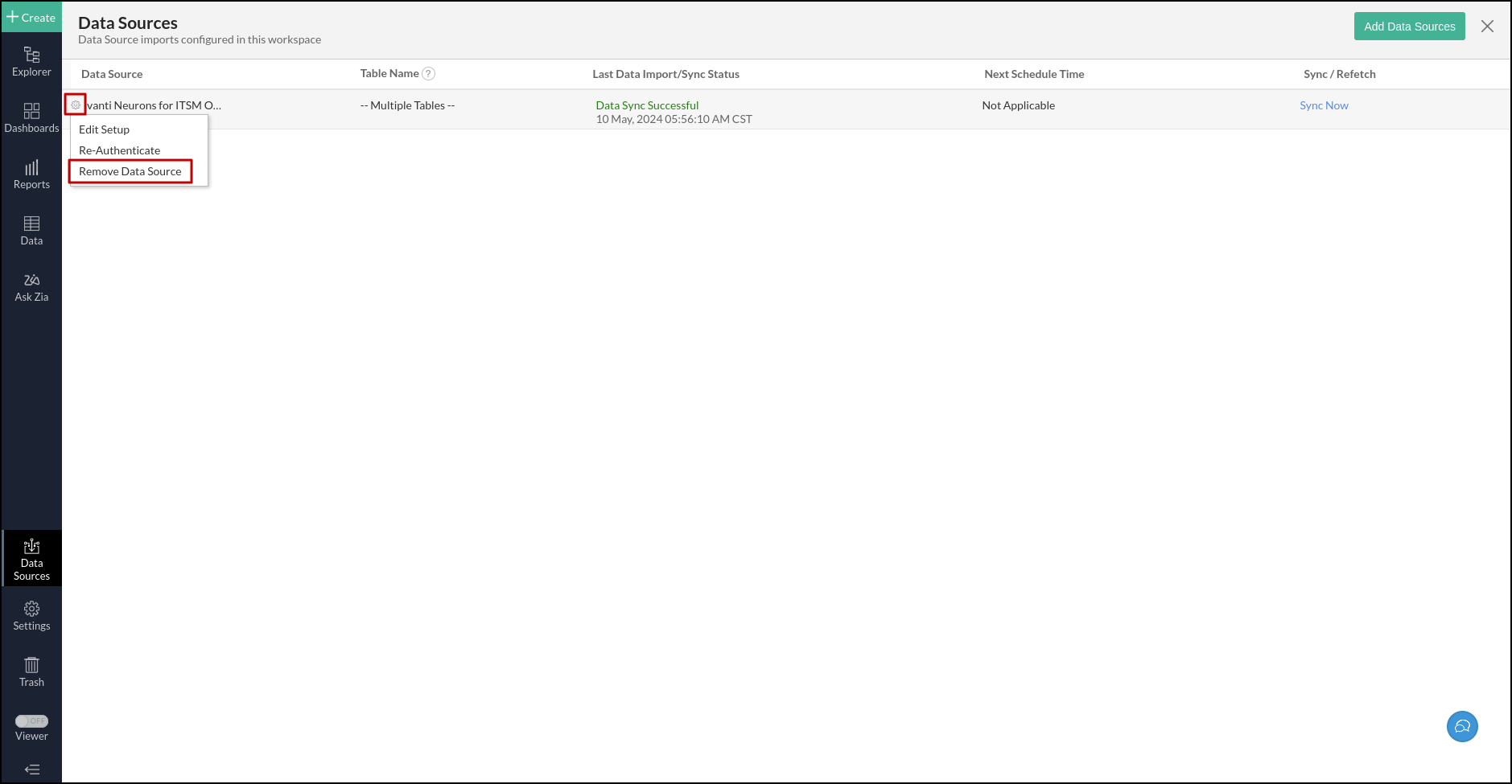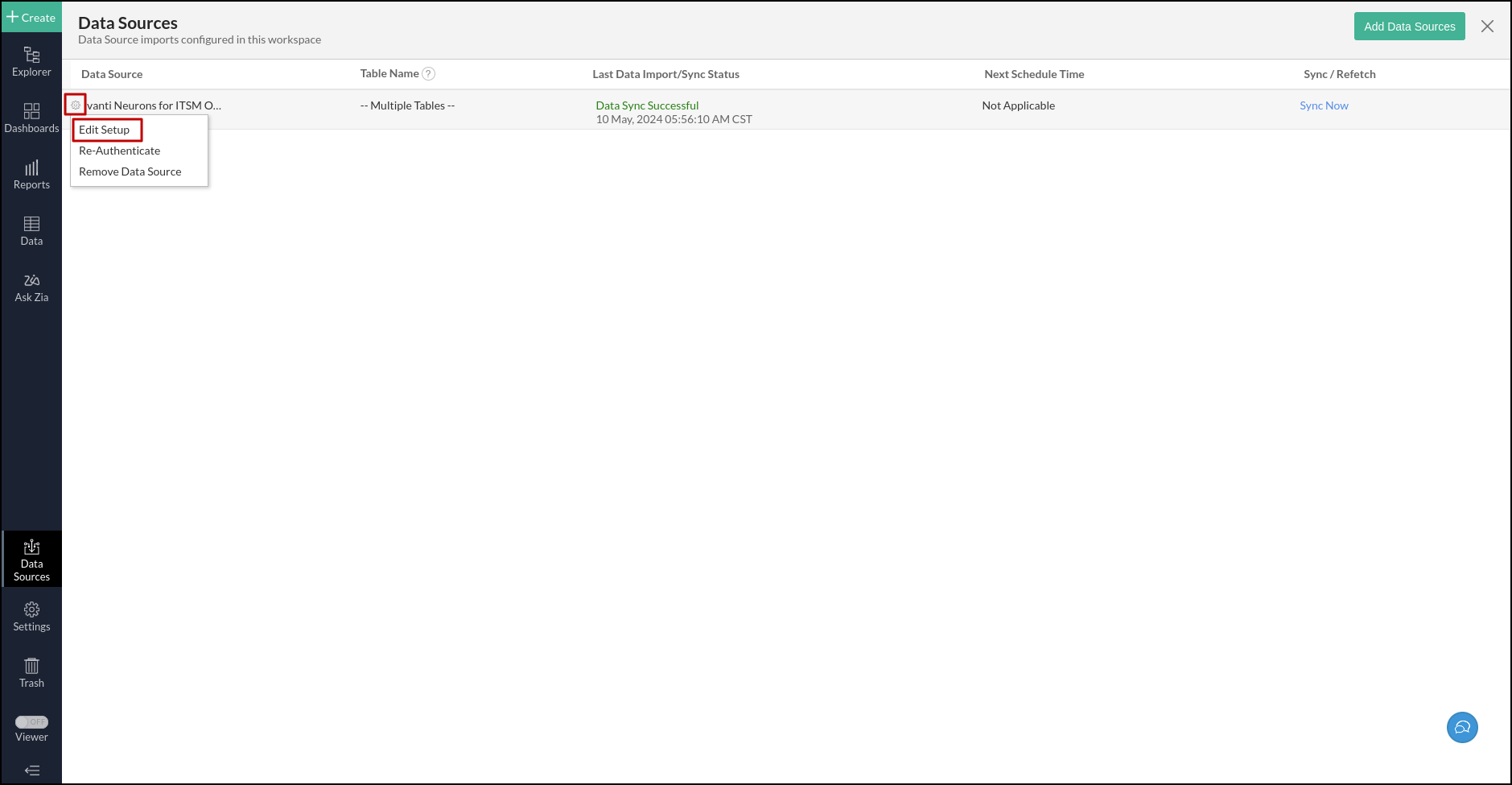 1. Click the Settings icon that appears on the mouse over the Ivanti Neurons for ITSM On-Premise data source and click the Edit Setup option.