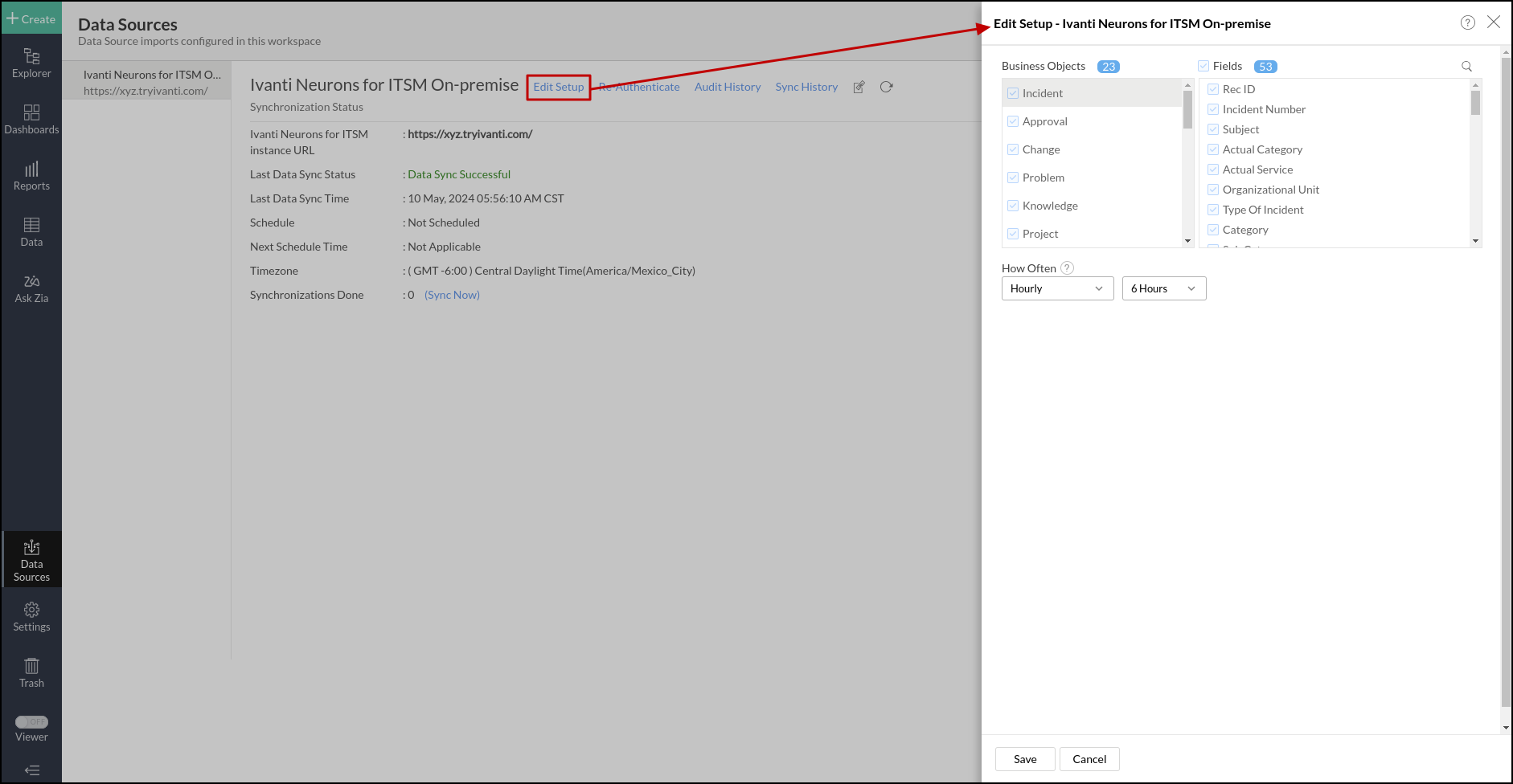 2. Navigate to the Ivanti Neurons for ITSM On-Premise data source, and click the Edit Setup link.