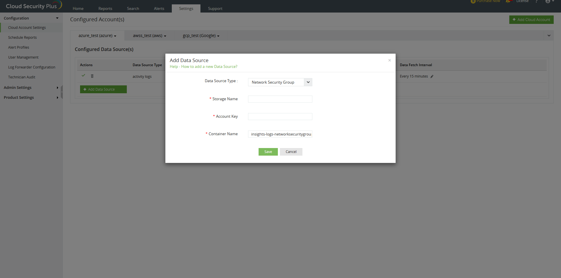 To add a network security group to Cloud Security Plus, open Cloud Security Plus, click on Settings → Azure account → Add Data Source.