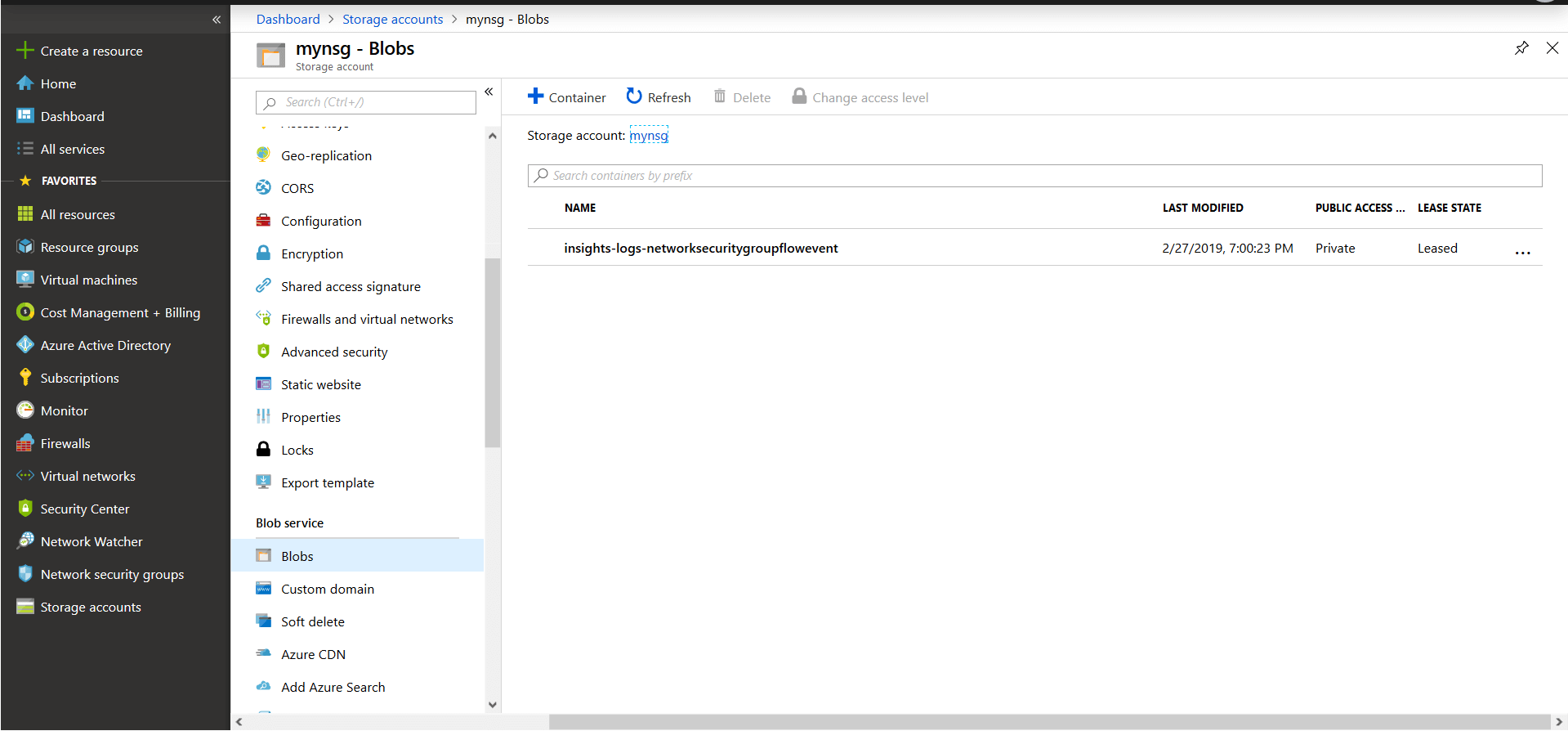 Check for a container with the name insights-logs-networksecuritygroupflowevent.