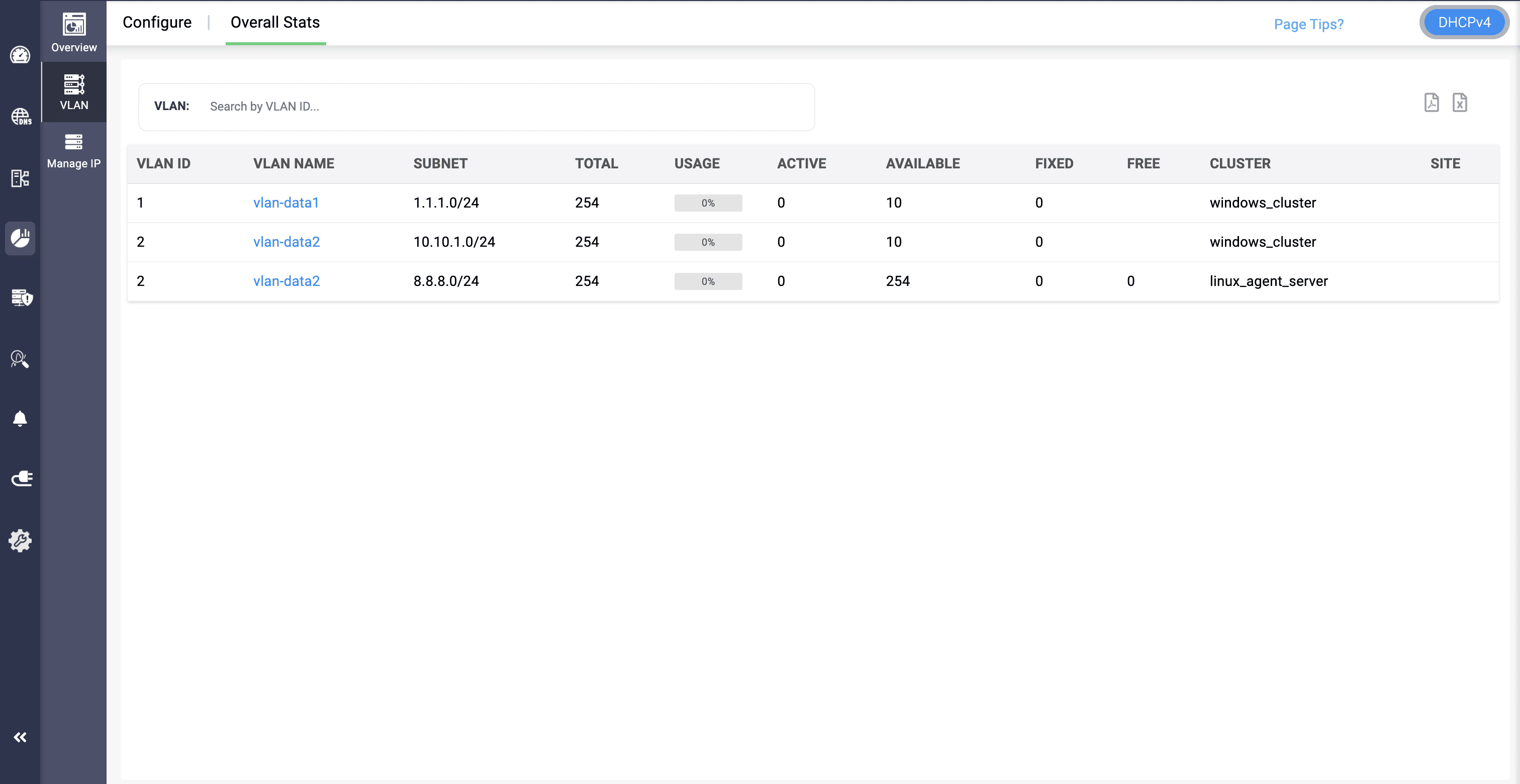 Note: The DHCP subnets can be managed and unmanaged by clicking on on the icons next to Clear Lease Data, Edit, and Delete. Subnets that are exceeding the limit that's given in their licensing can be unmanaged. Click here to