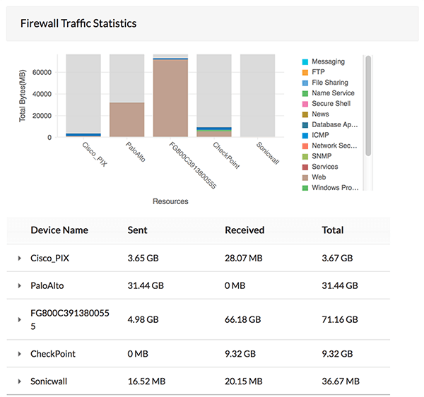 OpManager Plus provides an agentless log analytics and configuration module that helps you understand how bandwidth is being used in your network. OpManager Plus is vendor-agnostic and supports almost all open-source and commercial network firewalls, including those from Check Point, Cisco, Juniper, Fortinet, and Palo Alto Networks.