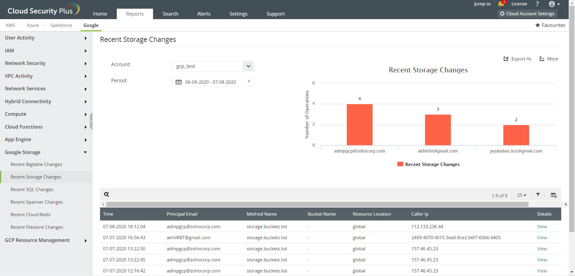 Log360 provides out-of-the-box reports on recent storage changes to ensure storage security. To mitigate data compromise, it also helps organizations detect suspicious activity by providing information on recent changes made to SQL instances hosted on Google Cloud Platform. These reports include information on the time of the event, the principal email, the resource location, and the caller IP. This helps security admins analyze these threats and mitigate security breaches.