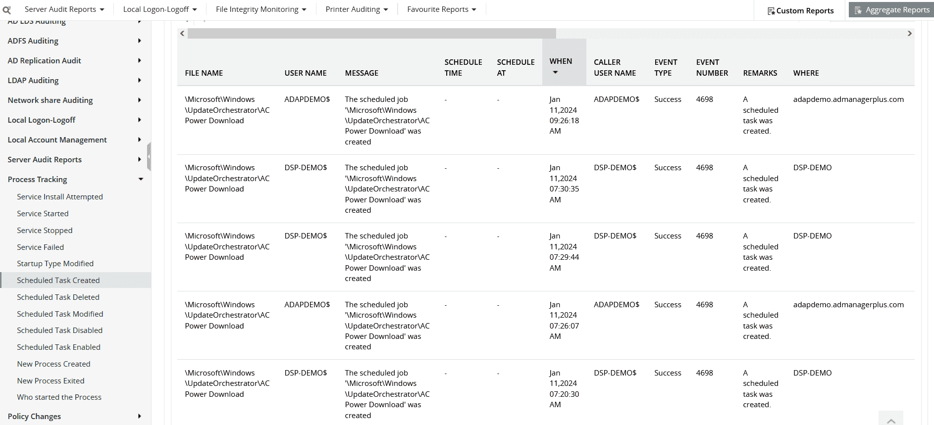 In this specific case of cron job or scheduled task monitoring, several prebuilt analytics in Log360 will help you track automated tasks in your network.