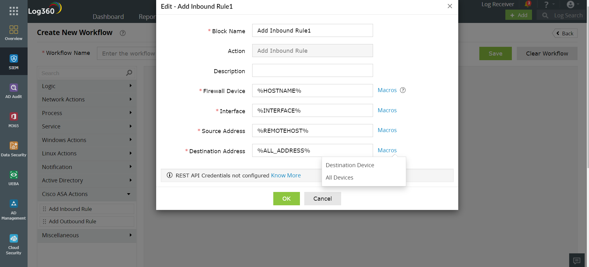 A unified SIEM solution like Log360 can help you create new firewall rules with its drag-and-drop option for building workflows.