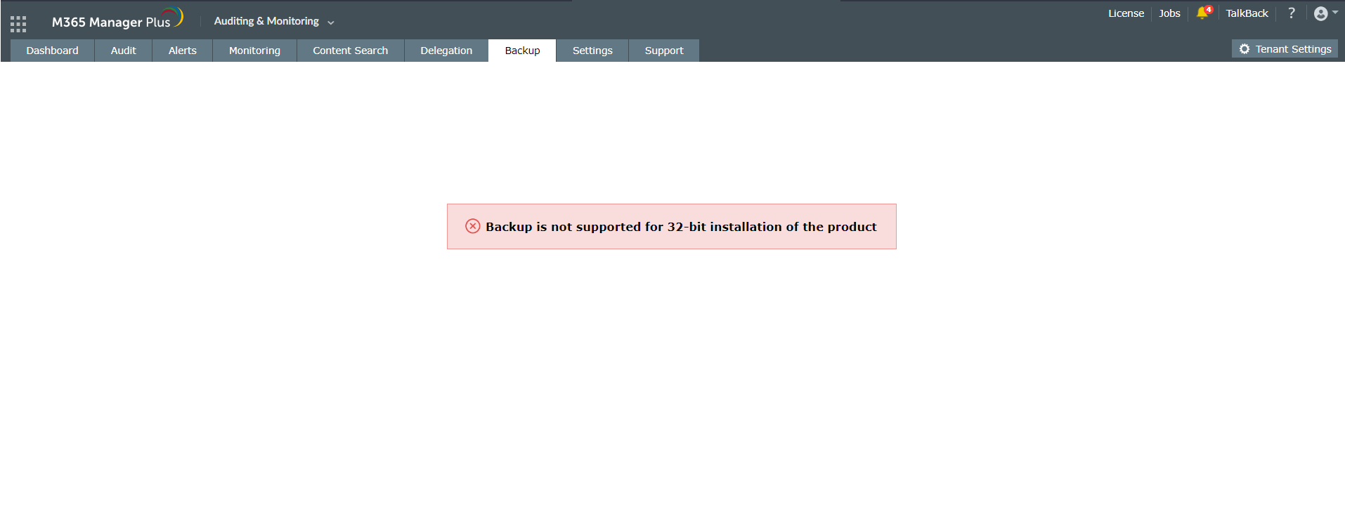If you are using a 32-bit version of M365 Manager Plus, you won't be able to back up data using the add-on. Install the 64-bit version of the product to enable backup.