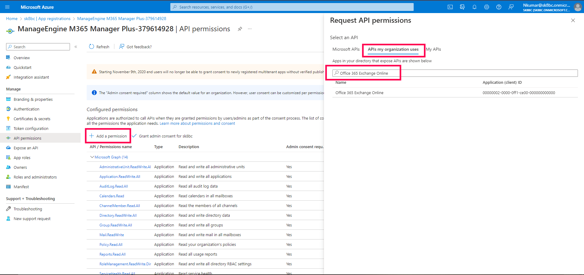 Note: The API permission full_access_as_app uses Exchange Web Services to backup and restore mailboxes.