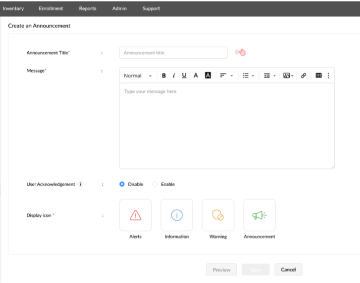 The Announcement Message can be customized with the various formatting parameters, and the Announcement can be categorized by selecting a Display Icon [Alerts, Information, Warning, Announcement]. Announcement Title, Message, and Display icon are mandatory fields.