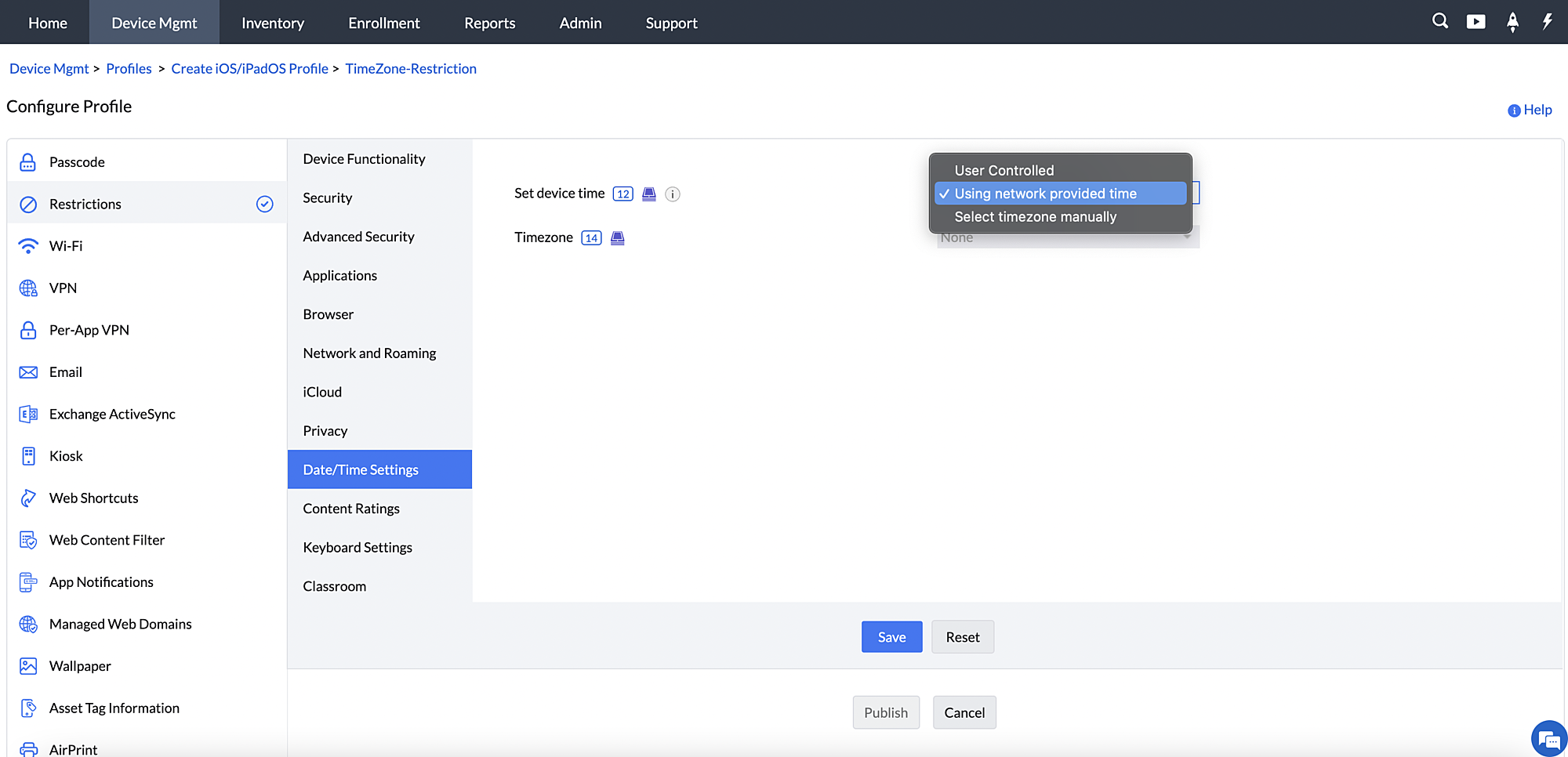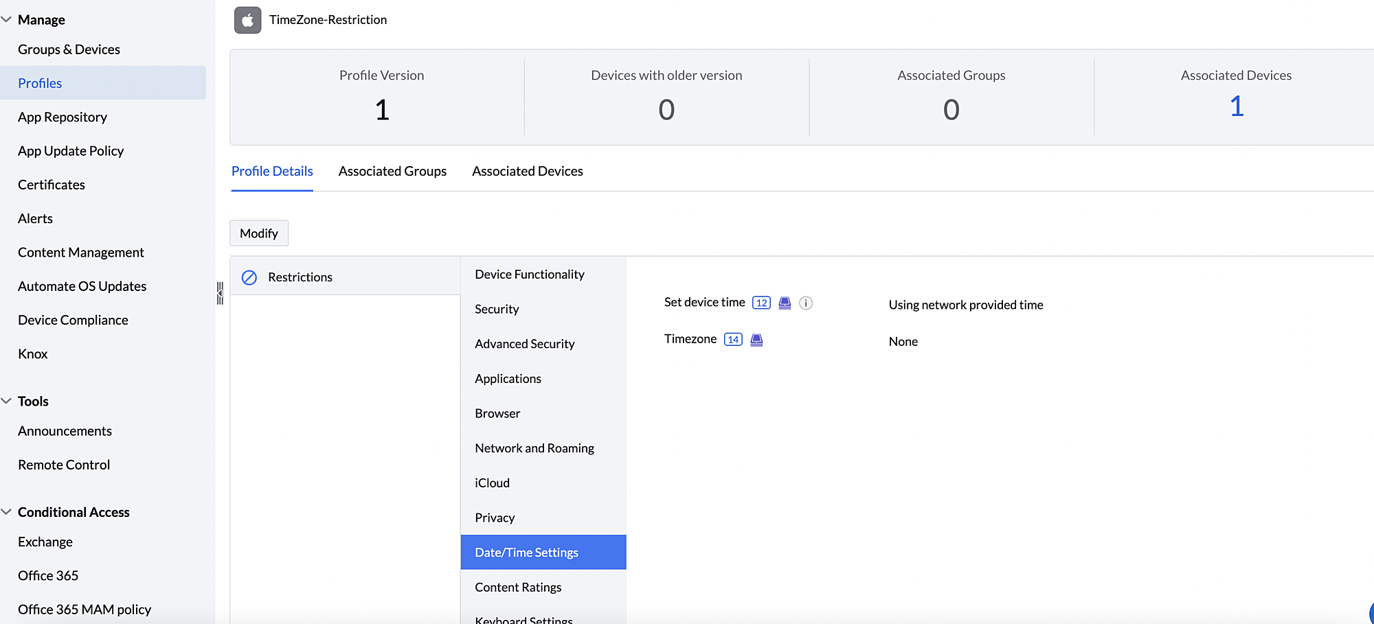 - Go to Device Mgmt -> Profiles, search for the profile name Timezone-Restriction and modifyit.
