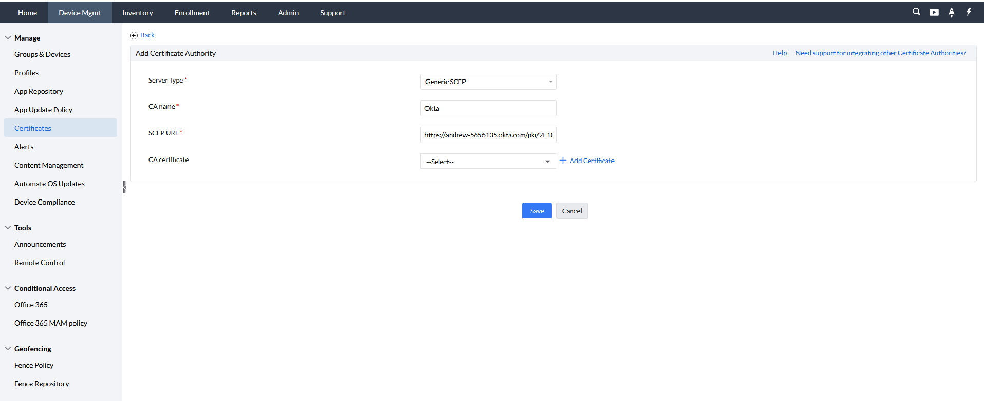- Paste the SCEP URL copied from Okta in the SCEP URL , and upload the CA certificate. Then click Save to proceed.