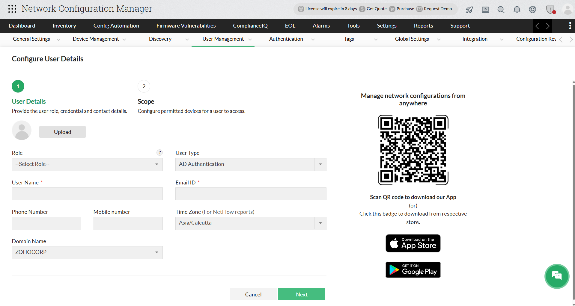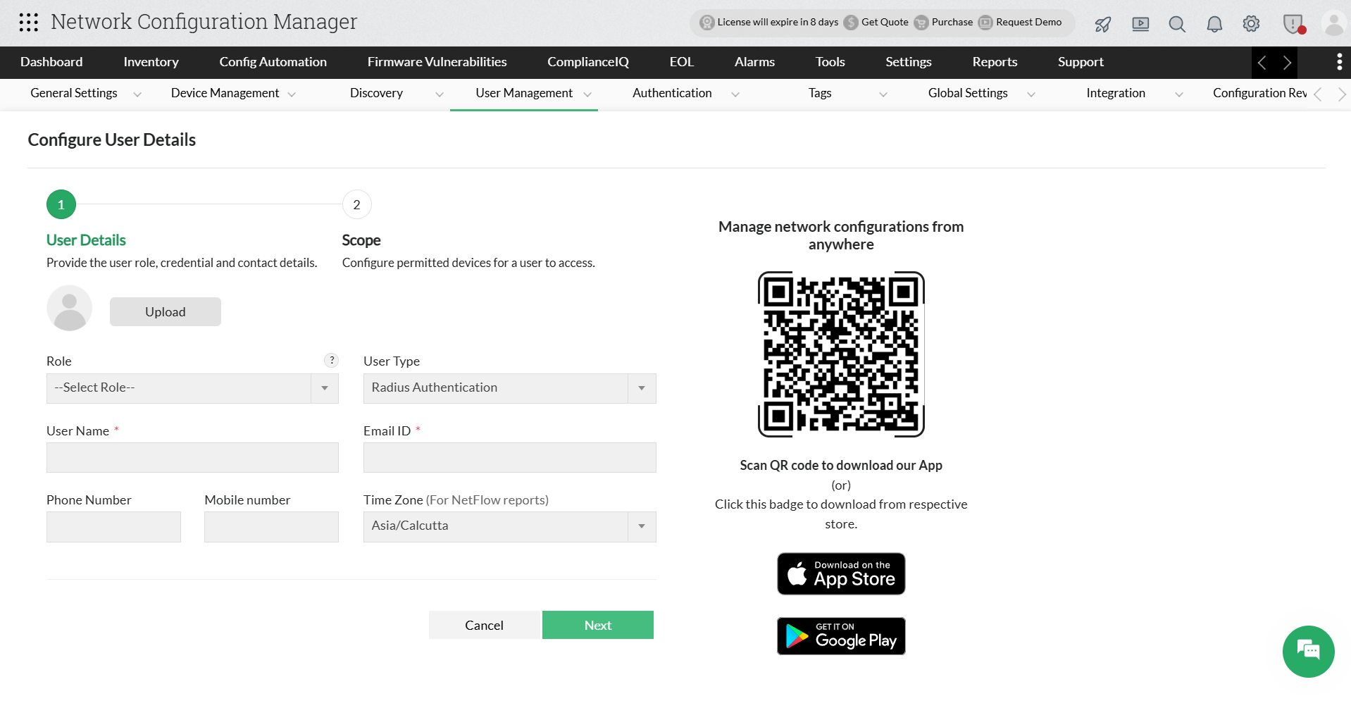 You can create users in Network Configuration Manager and provide access privileges to them. The power to create users is available only for the admin login account and for those accounts which have 'Full Control' privilege.