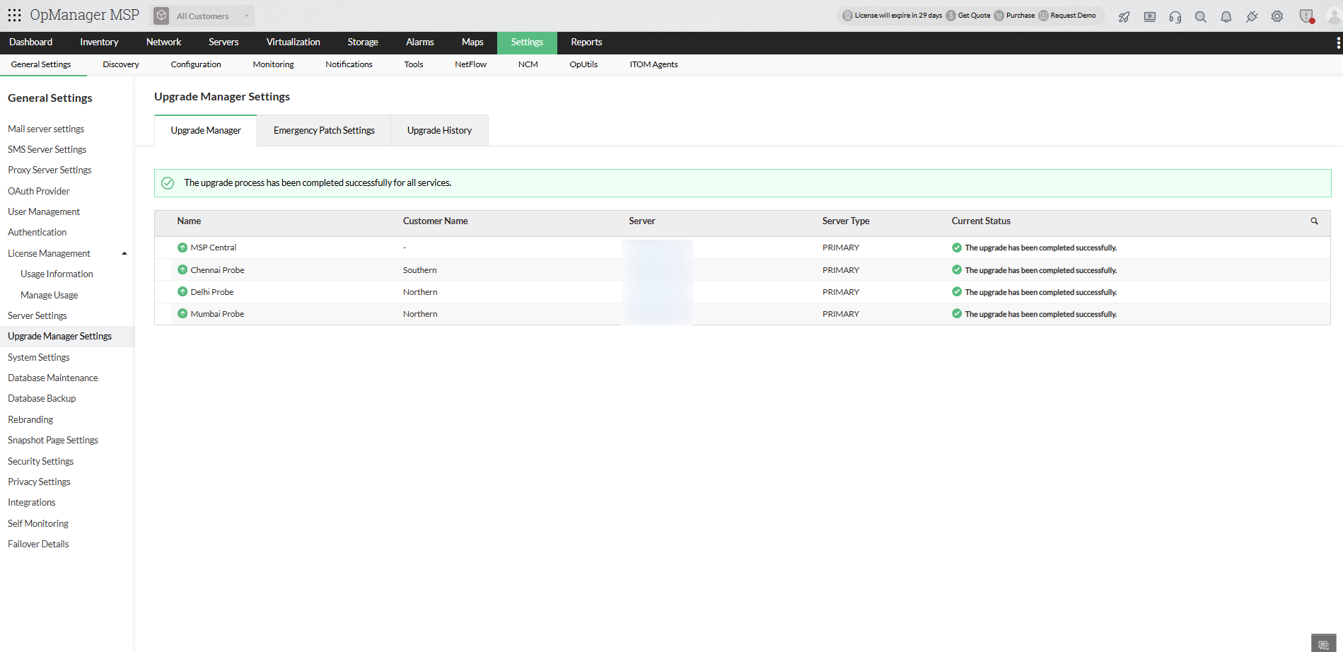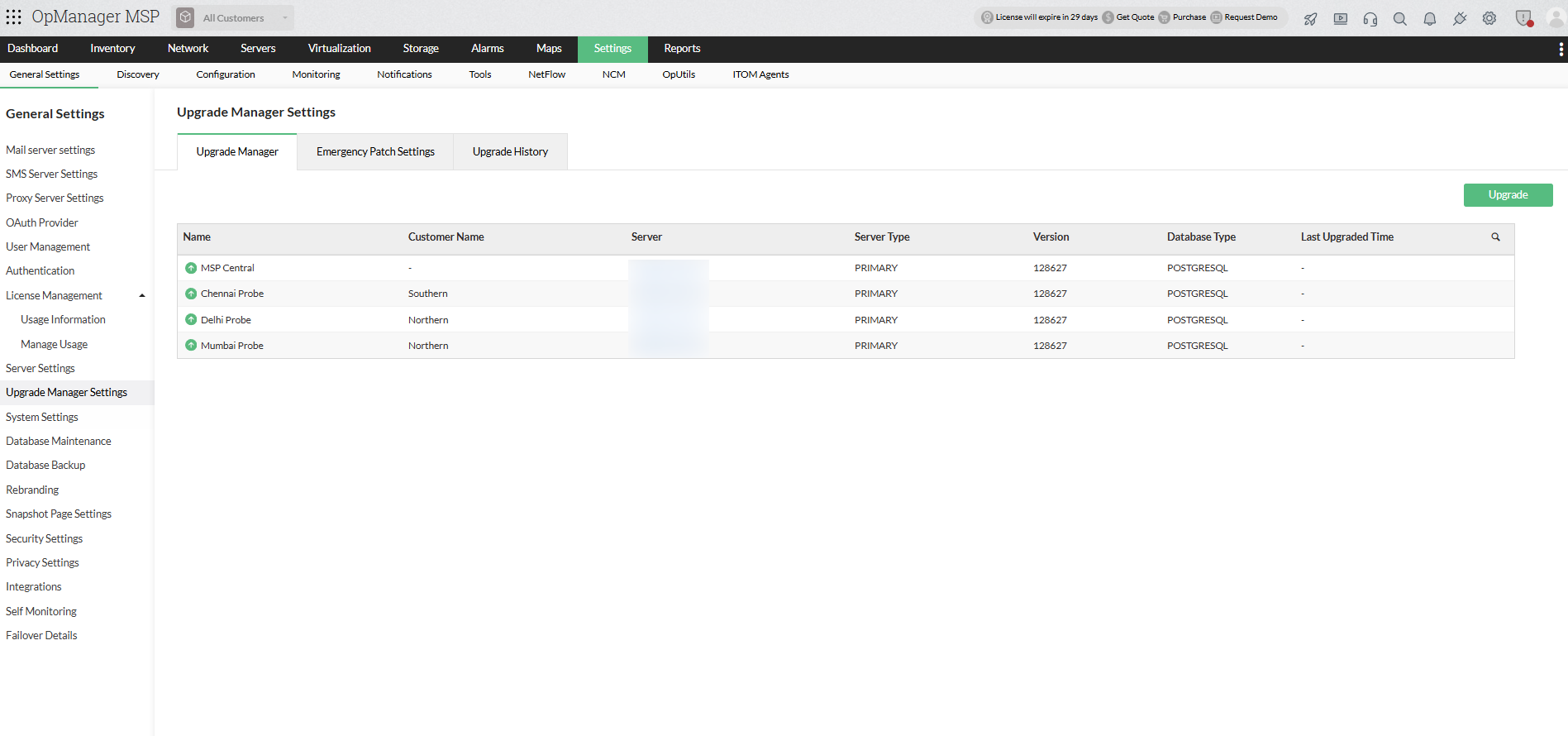 The upgrade process for OpManager - installed servers across your network is simplified using the Upgrade Manager. It offers a centralised platform to manage and perform upgrades for OpManager Central, Probes, their Failover servers. The enhanced smart upgrade feature helps to overcome the bottlenecks faced during the upgrade process.
