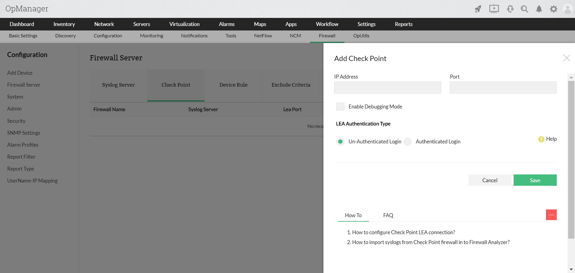 OpManager lets you add LEA servers to establish connections and retrieve logs from Check Point firewalls. You can add as many LEA servers as needed, and set up authenticated or unauthenticated connections to retrieve firewall logs.