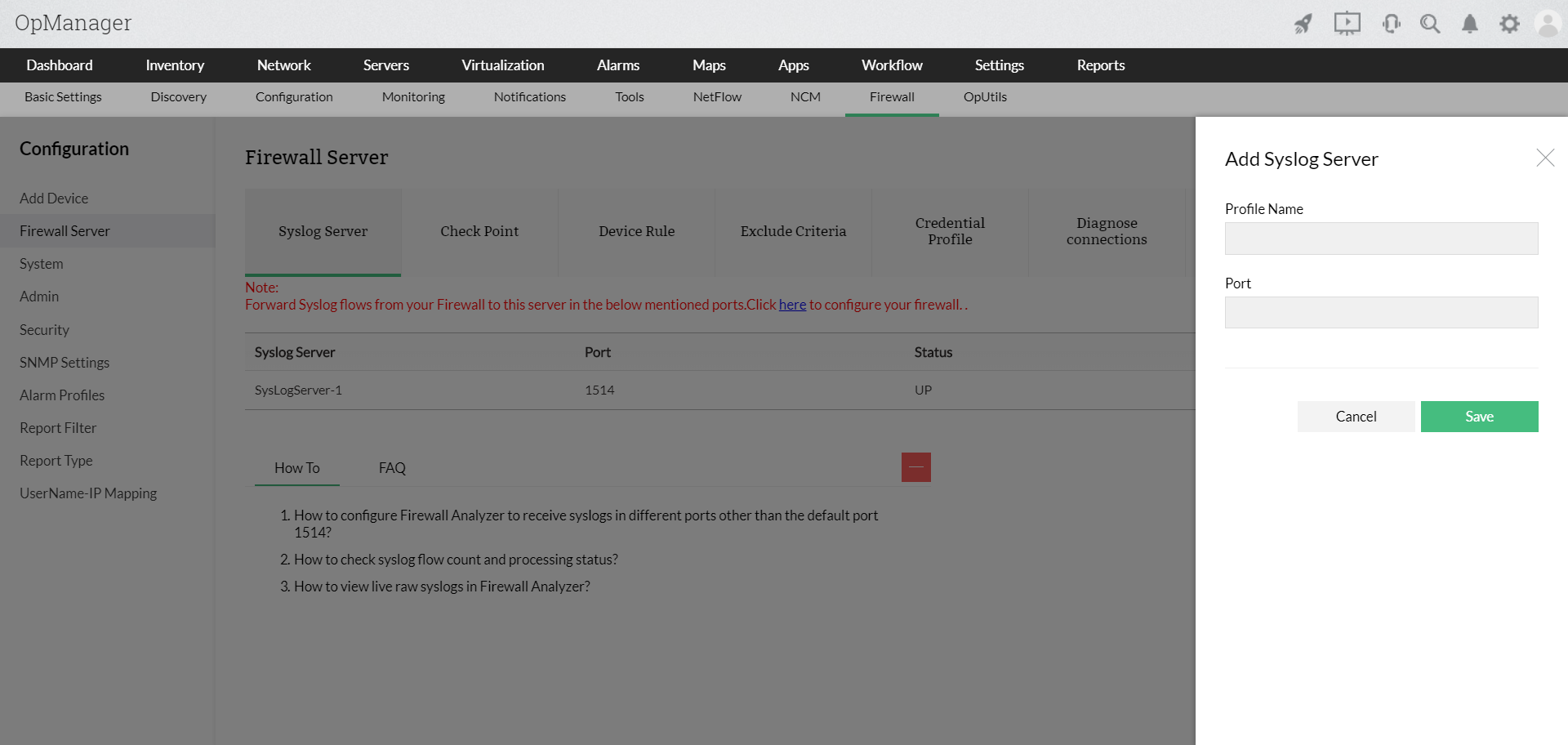 OpManager comes pre-bundled with a syslog server that listens for forwarded firewall logs at the defined listener ports. You can add more listener ports to this syslog server, to collect logs from different firewalls. The syslog server is a part of OpManager and does not require a separate installation.