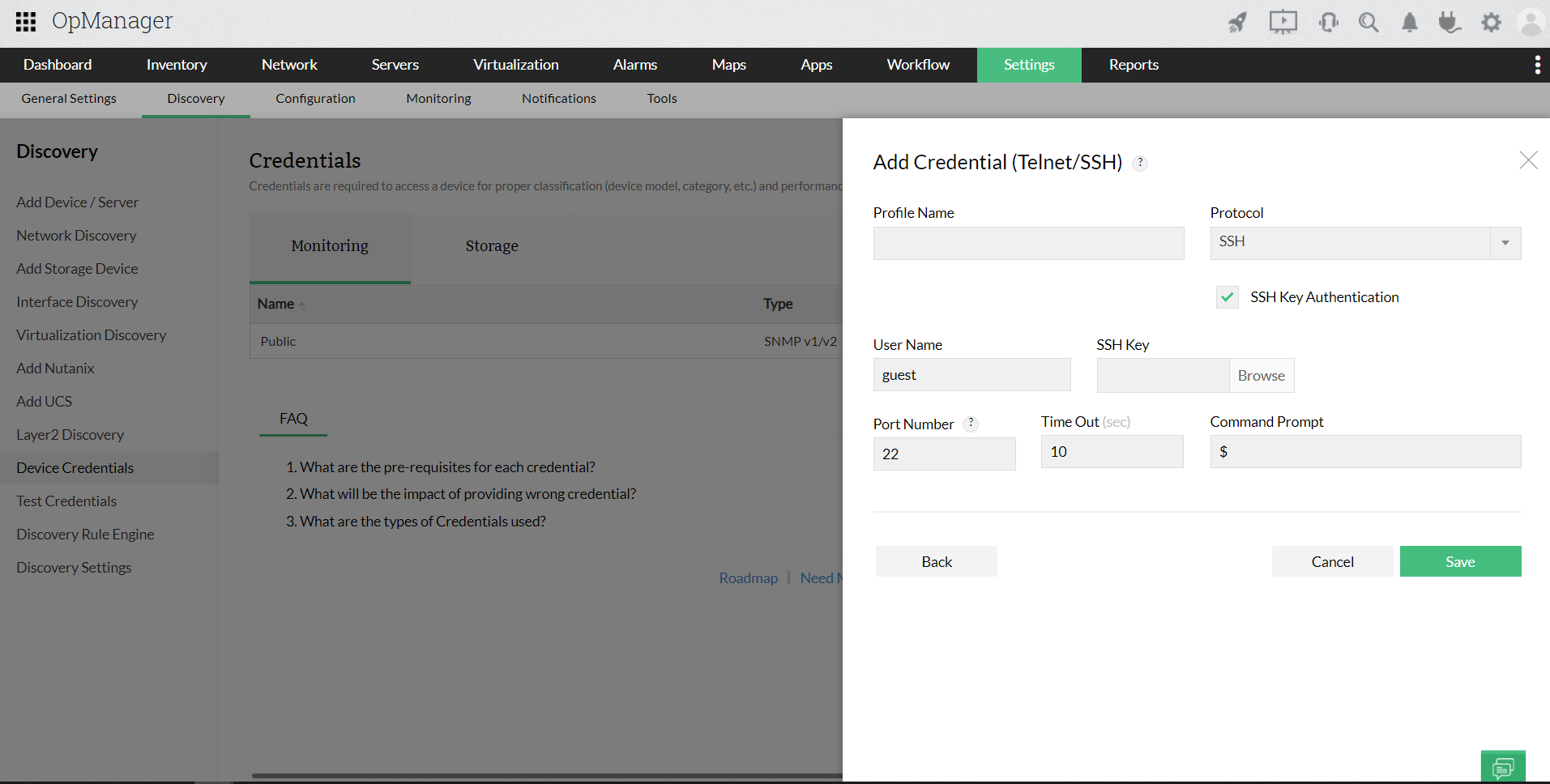 • In the OpManager server, go to Settings -> Discovery -> Device Credentials.
