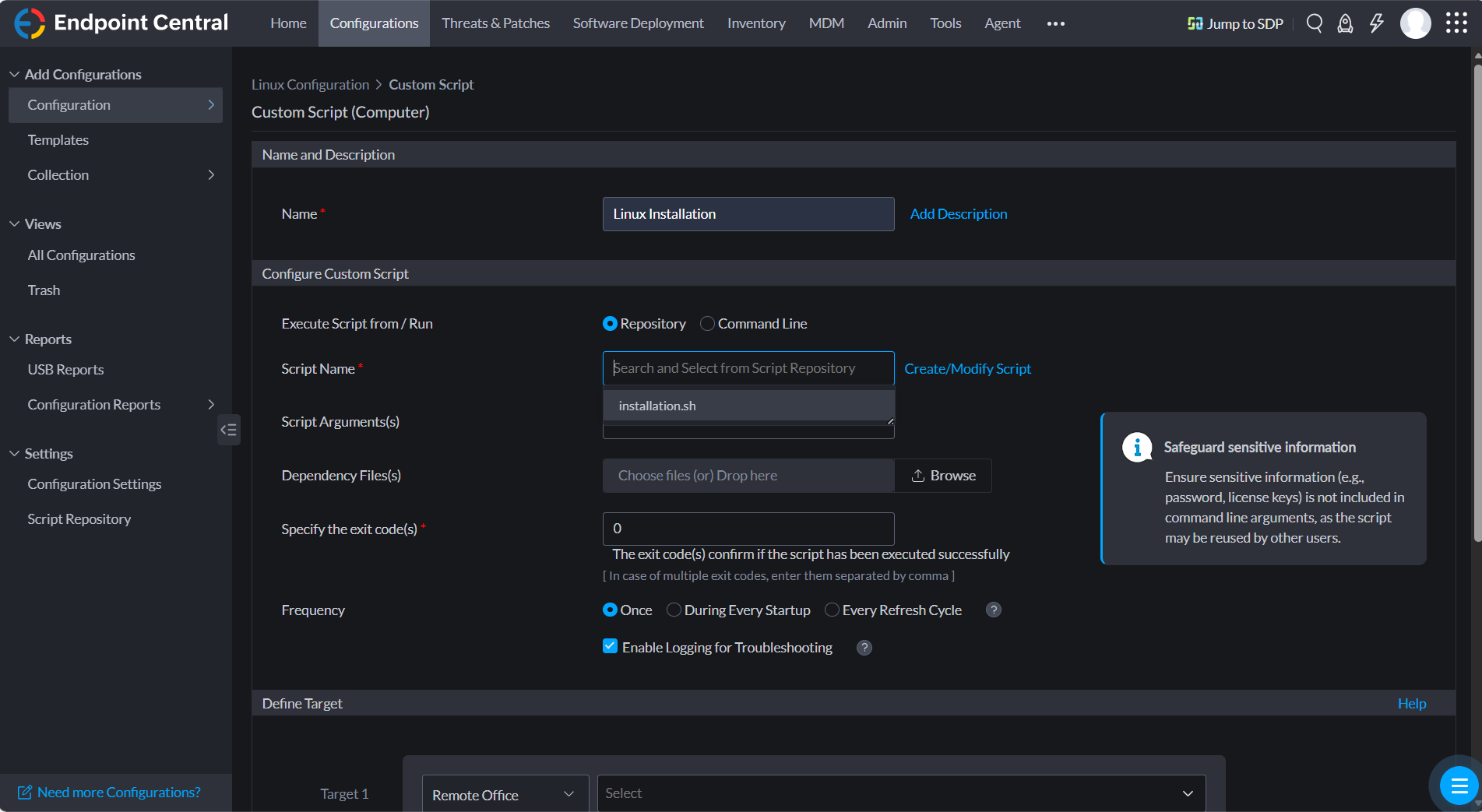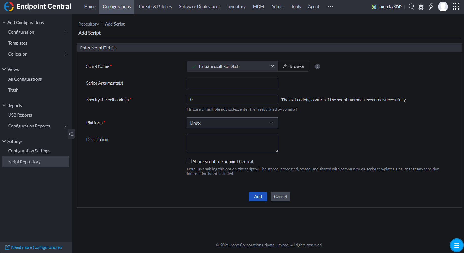 In Endpoint Central, navigate to Configurations → Settings → Script Repository.