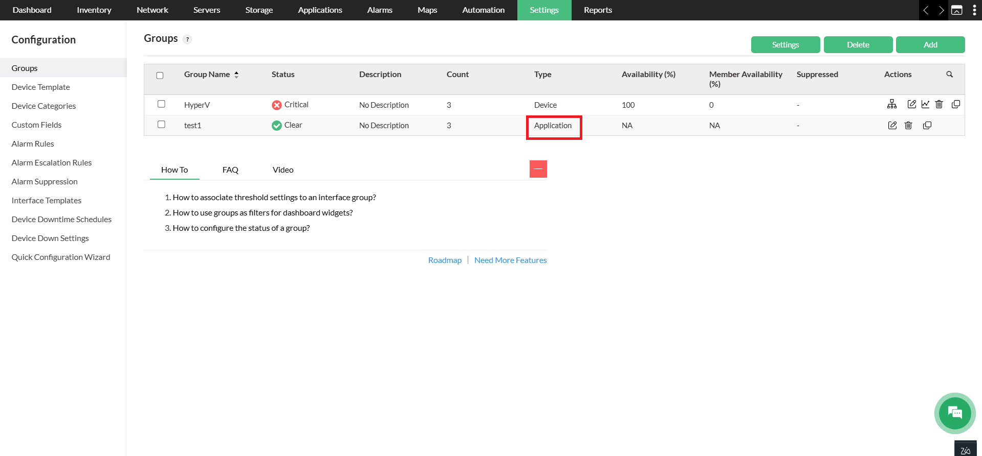 Once configured, the group will be listed under the Groups page. Application monitors will be specified (Application) under the Type column, distinguishing them from group types.