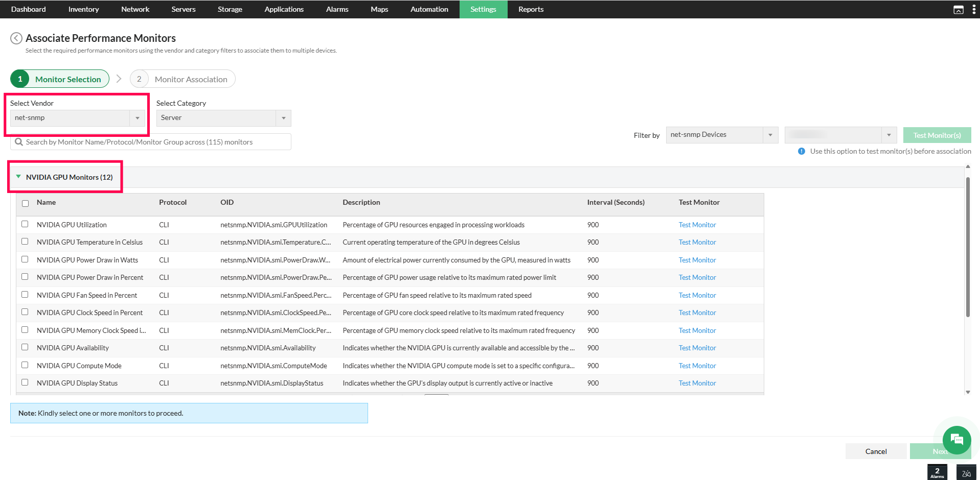 Performance monitors can be associated to multiple devices in bulk from the Settings page. The steps below cover associating the 12 NVIDIA GPU monitors available under the net-snmp vendor to one or more devices. Devices will be associated with the monitors only when the respective CLI credentials are configured for those devices.