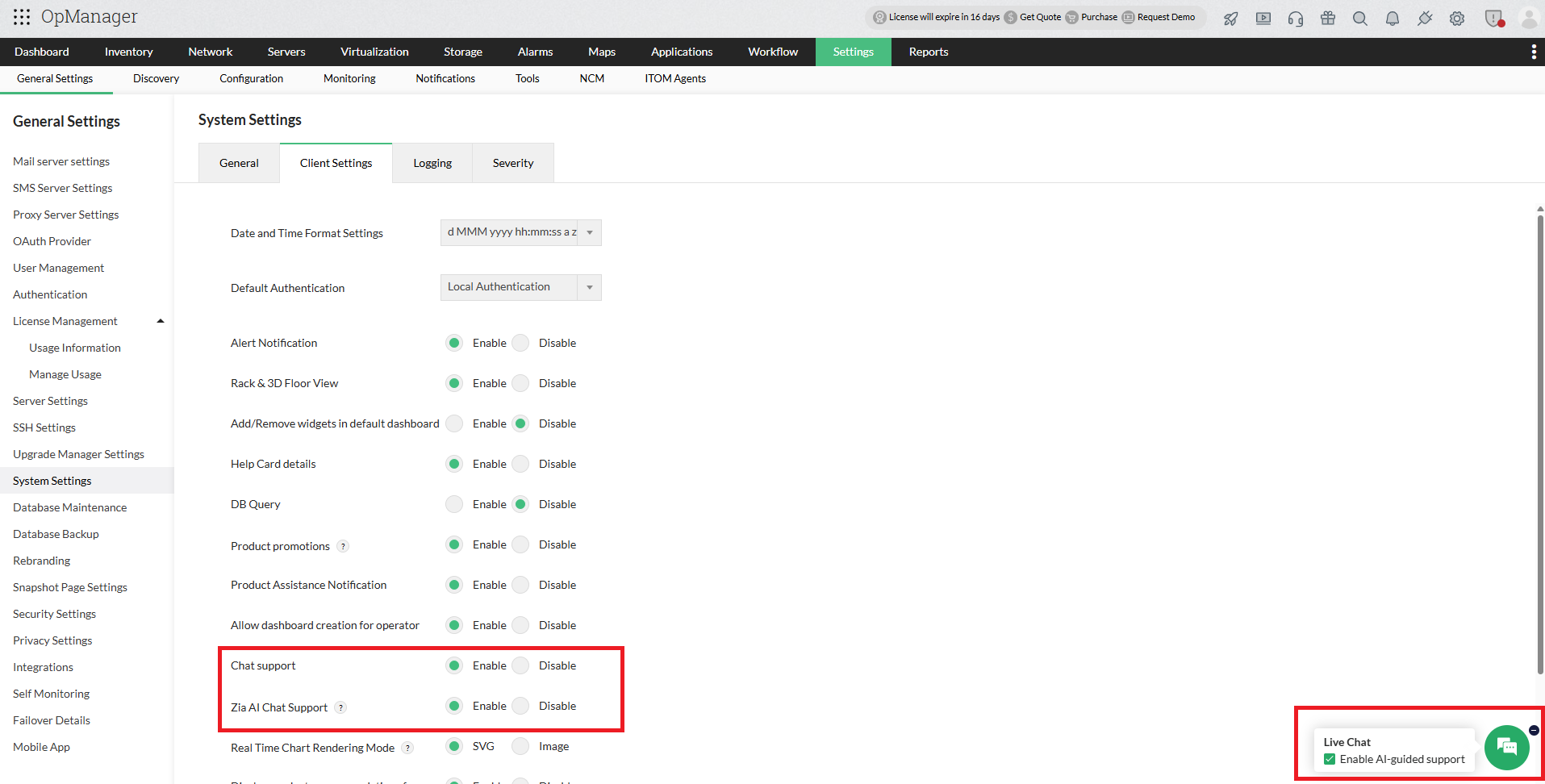 - The above setting applies globally to all users in OpManager. Individual users can also disable Zia Chat support for their own roles by hovering over the floating Chat icon at the bottom right and selecting the disable option.
