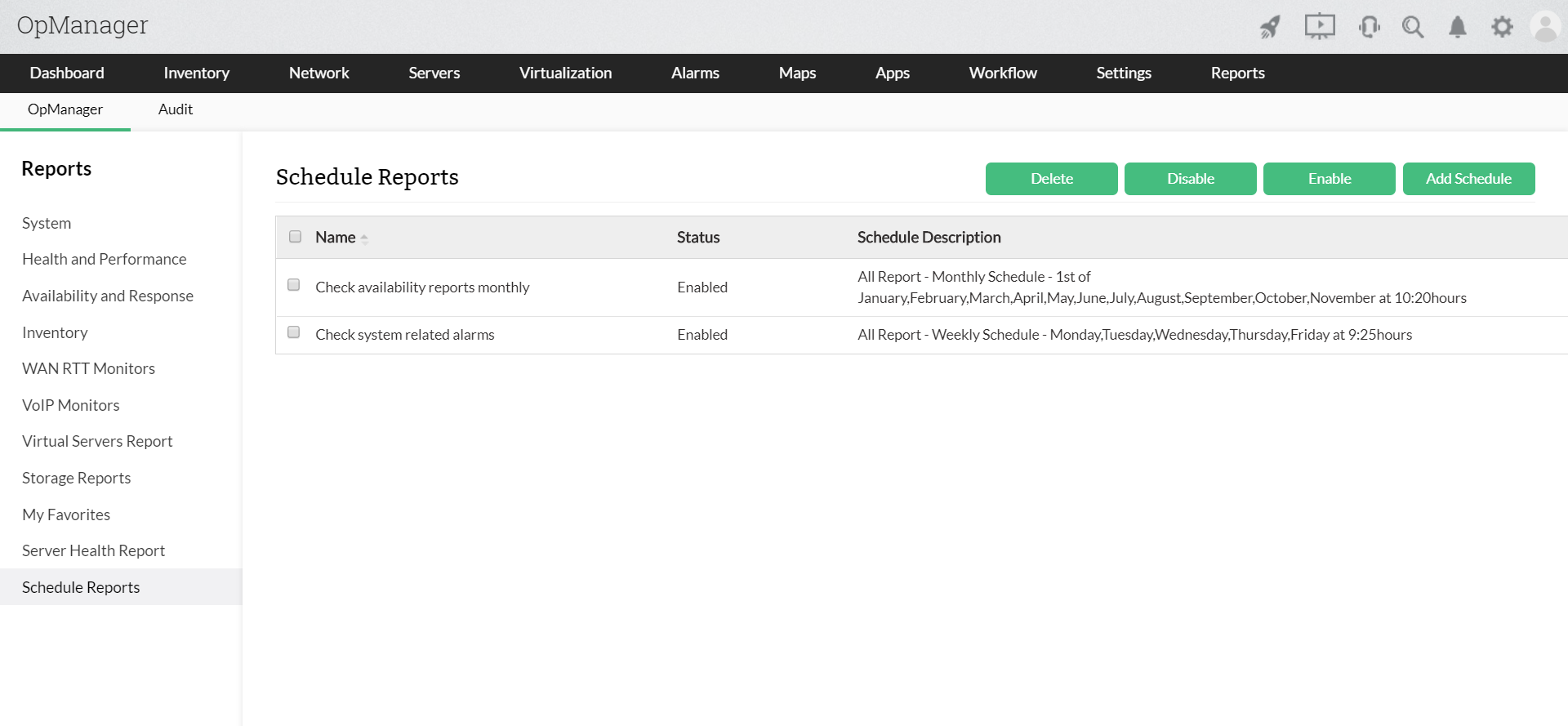 OpManager offers you the flexibility to configure the cadence of report delivery. Reports can be scheduled on a daily, weekly or monthly basis. Also, the generated reports can be delivered in either PDF or XLS formats.