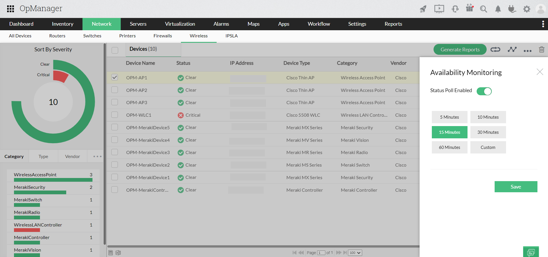 OpManager's Wi-Fi monitoring uses various network protocols, such as ICMP, TCP and SNMP, to continually poll your Wi-Fi components. This Wi-Fi monitor automates network polling by enabling you to set up the required polling intervals. Once set, OpManager's Wi-Fi monitoring tool automatically triggers the polls at the set intervals. Polling determines the availability of your Wi-Fi components and helps analyze the downtime statistics and historical logs.