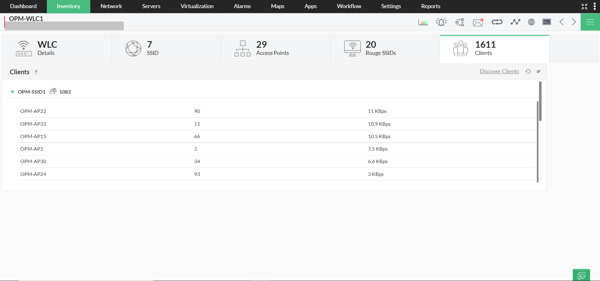 OpManager's Wi-Fi analyzer software offers you in depth visibility into your Wi-Fi networks with its comprehensive set of Wi-Fi monitors. As a part of the network discovery process, it discovers and identifies wireless networking components, such as the Wireless LAN Controllers and access points. Once discovered, OpManager classifies these devices based on aspects such as the device type, and automatically monitors them.
