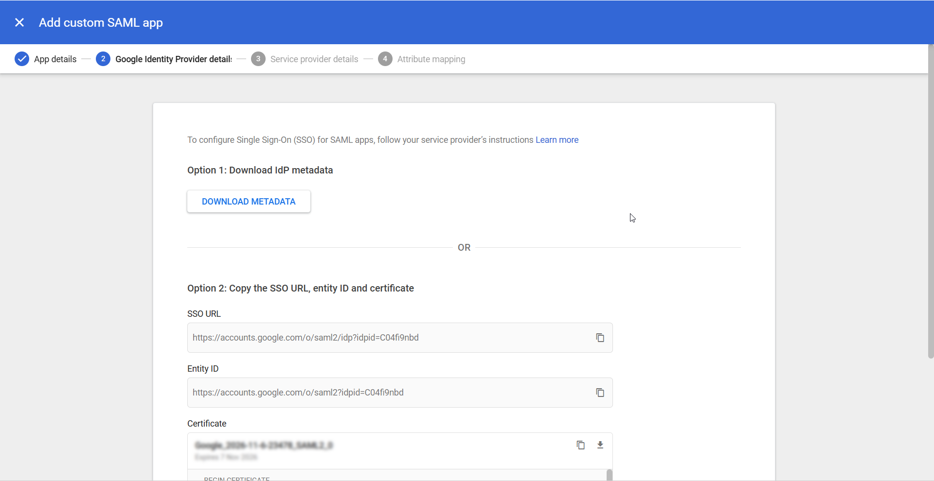 - On the Google Identity Provider details section, click the DOWNLOAD METADATA button under Option 1 to download the IdP details as an XML file. Alternatively, you can manually populate the IdP details on PAM360 while configuring Google as an IdP. Click Continue to proceed to the next step.
