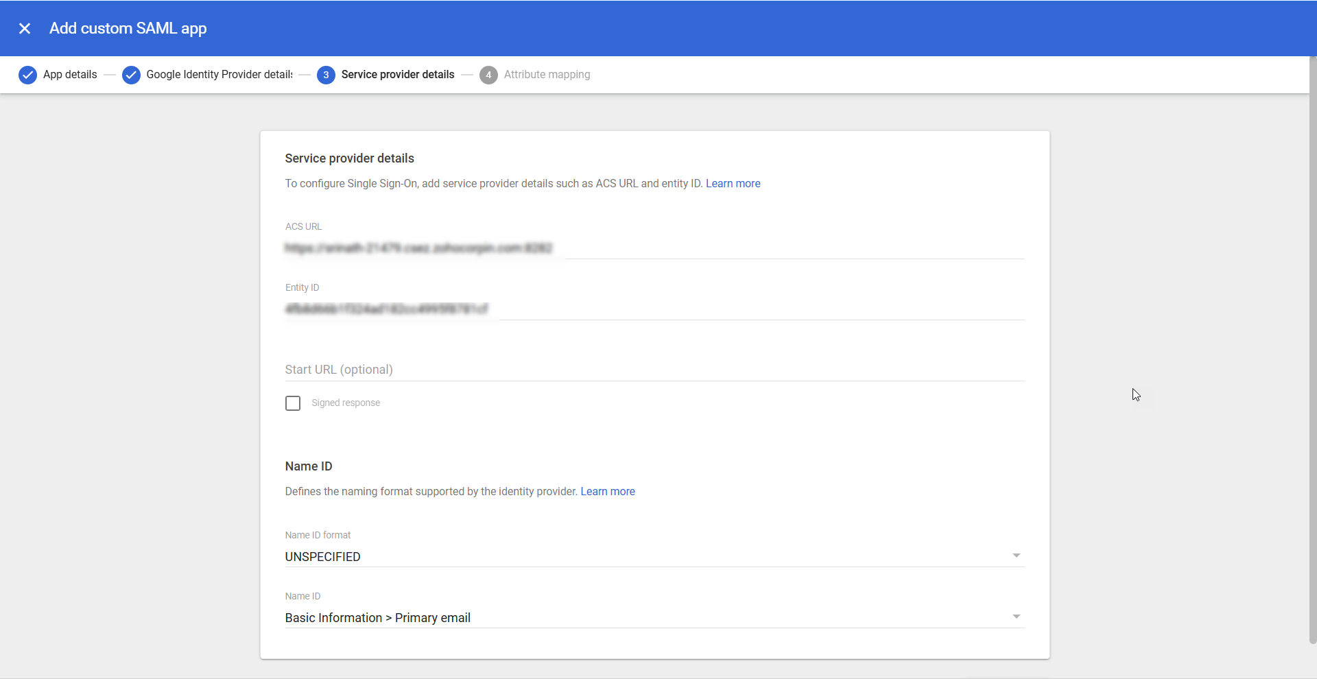 - After configuring the Service provider details, click Continue to proceed to the next step, Attribute mapping.