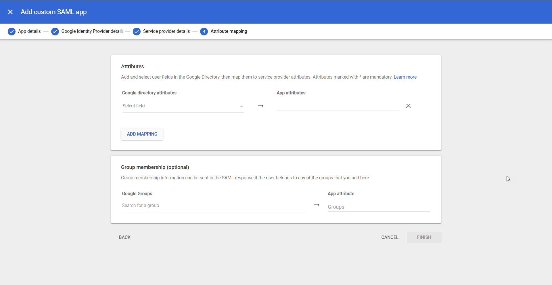 - On the Attribute Mapping page, click the ADD MAPPING button under the Attributes section to map the Google directory attributes with the App attributes.